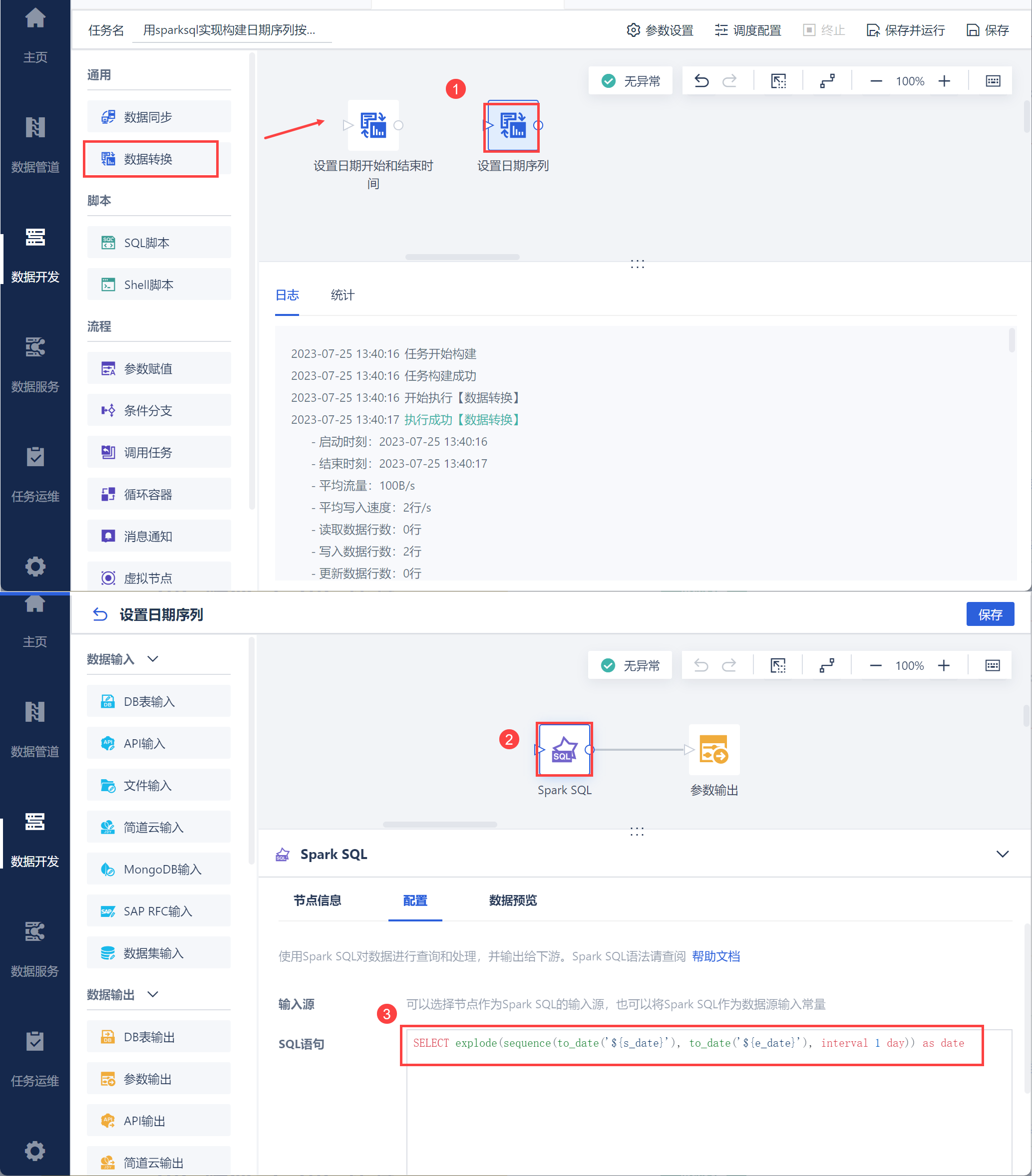 新建定时任务后,新增「数据转换」节点,进入编辑界面后新增「SparkSQL」算子,输入语句创建日期序列,如下图所示: