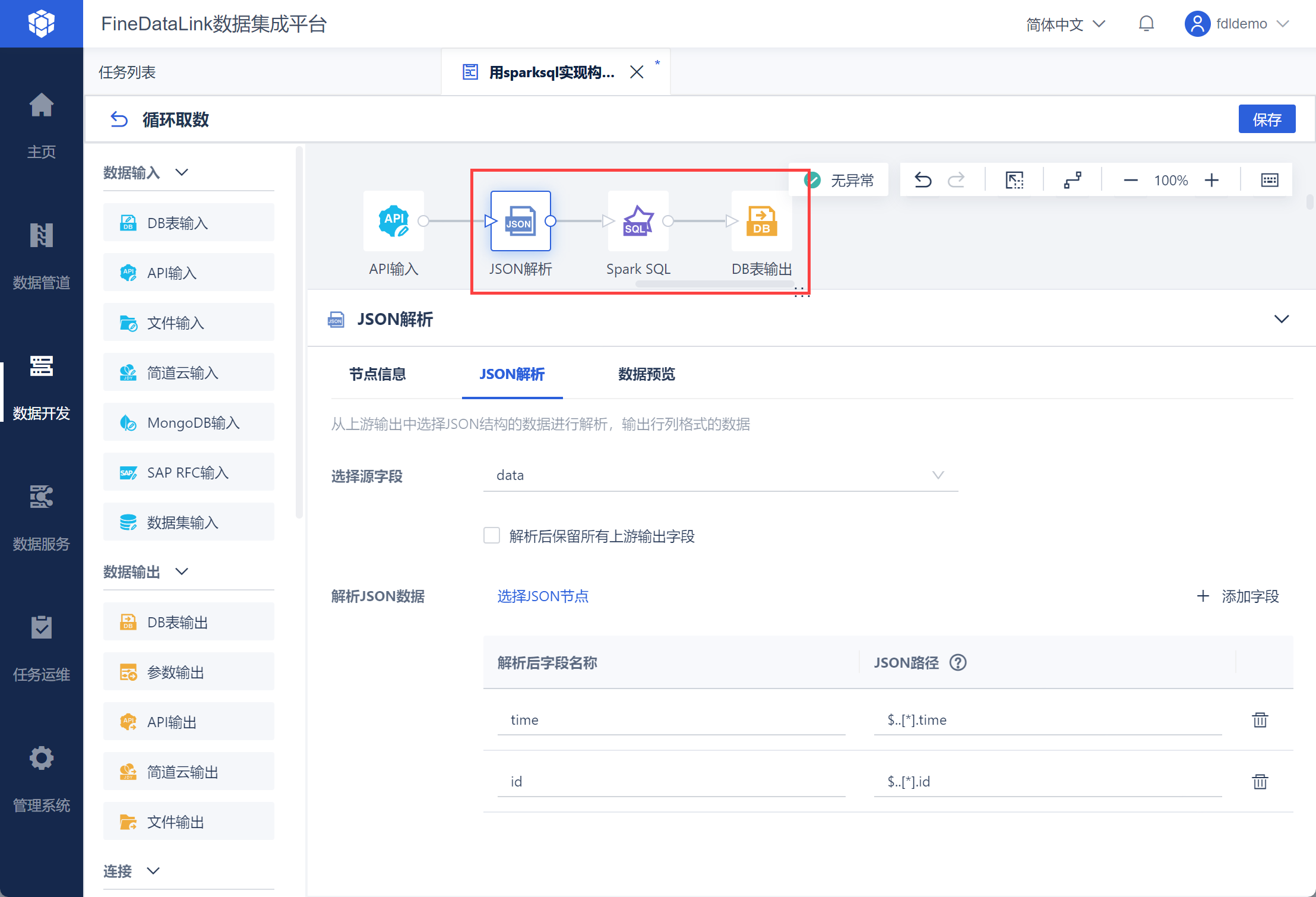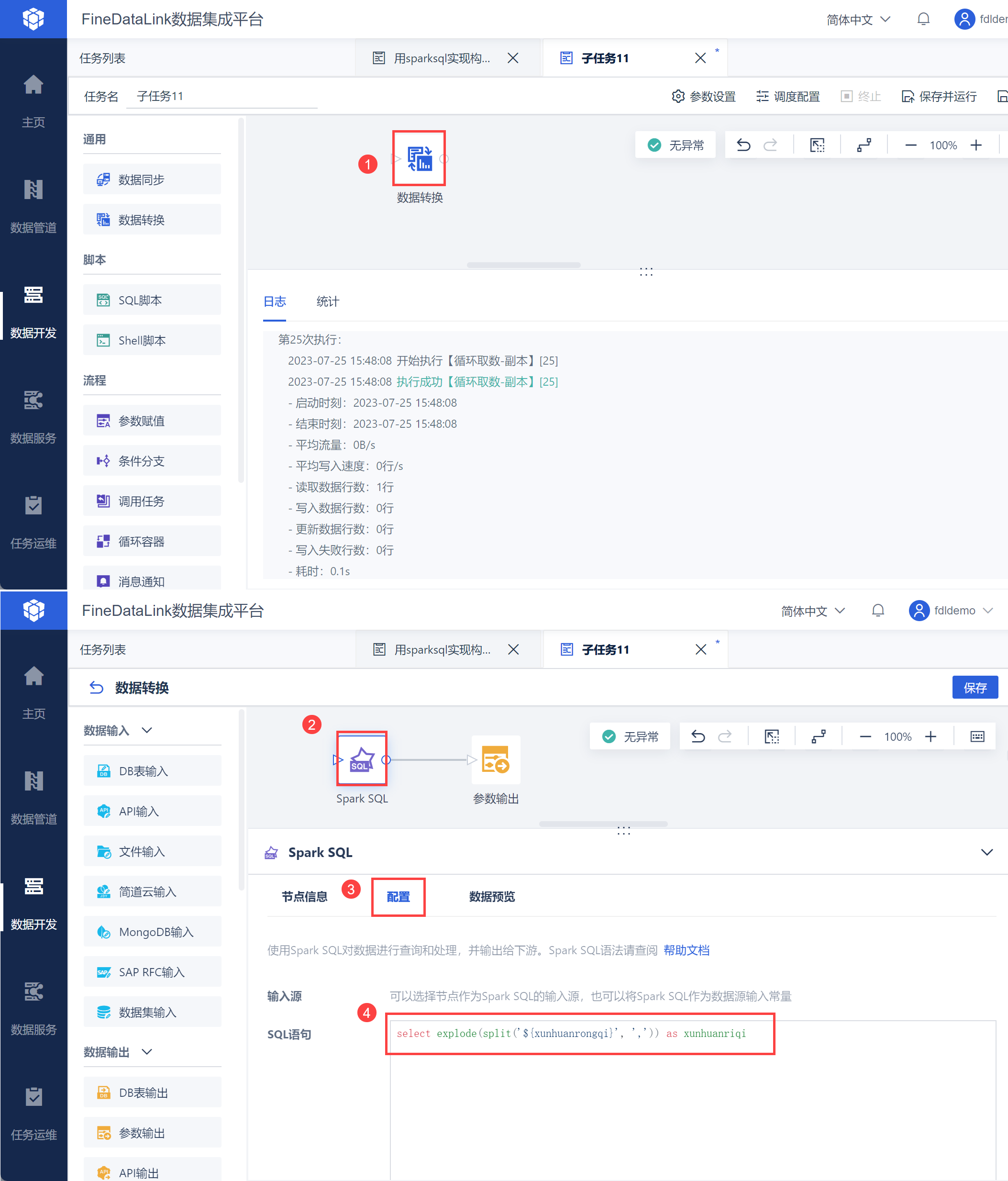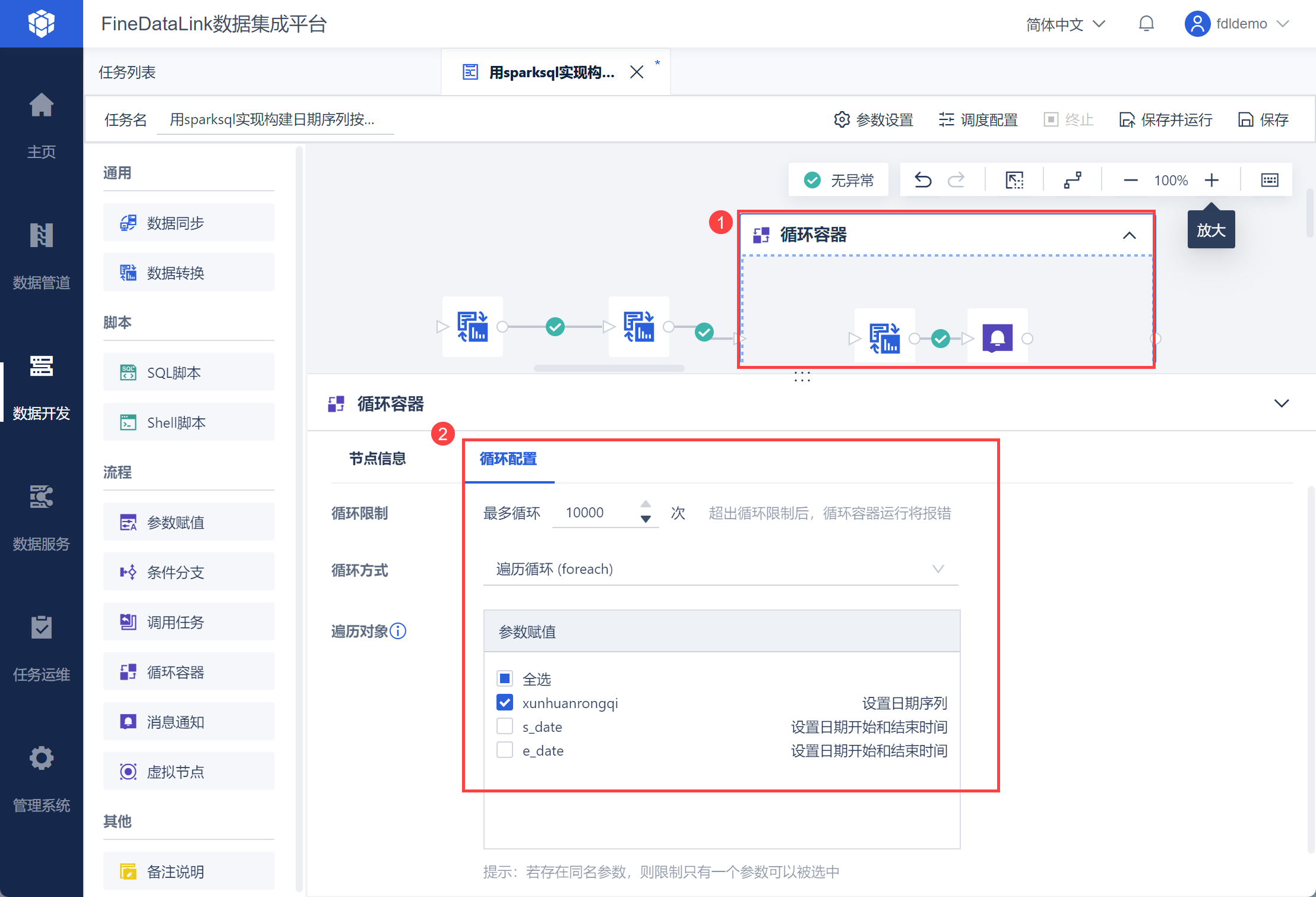 FineDataLink 中的数据处理过程,详情参见:https://demo.finedatalink.com/ 「使用SparkSQL构建日期列并循环取数1」。