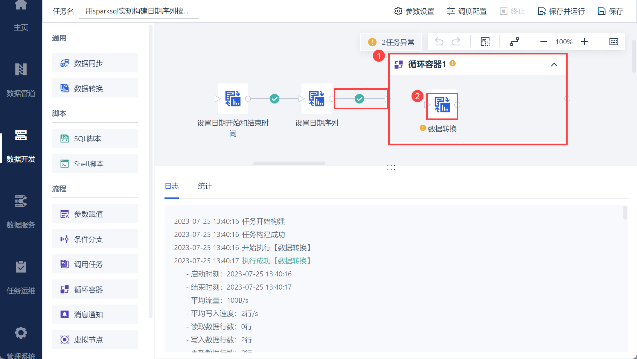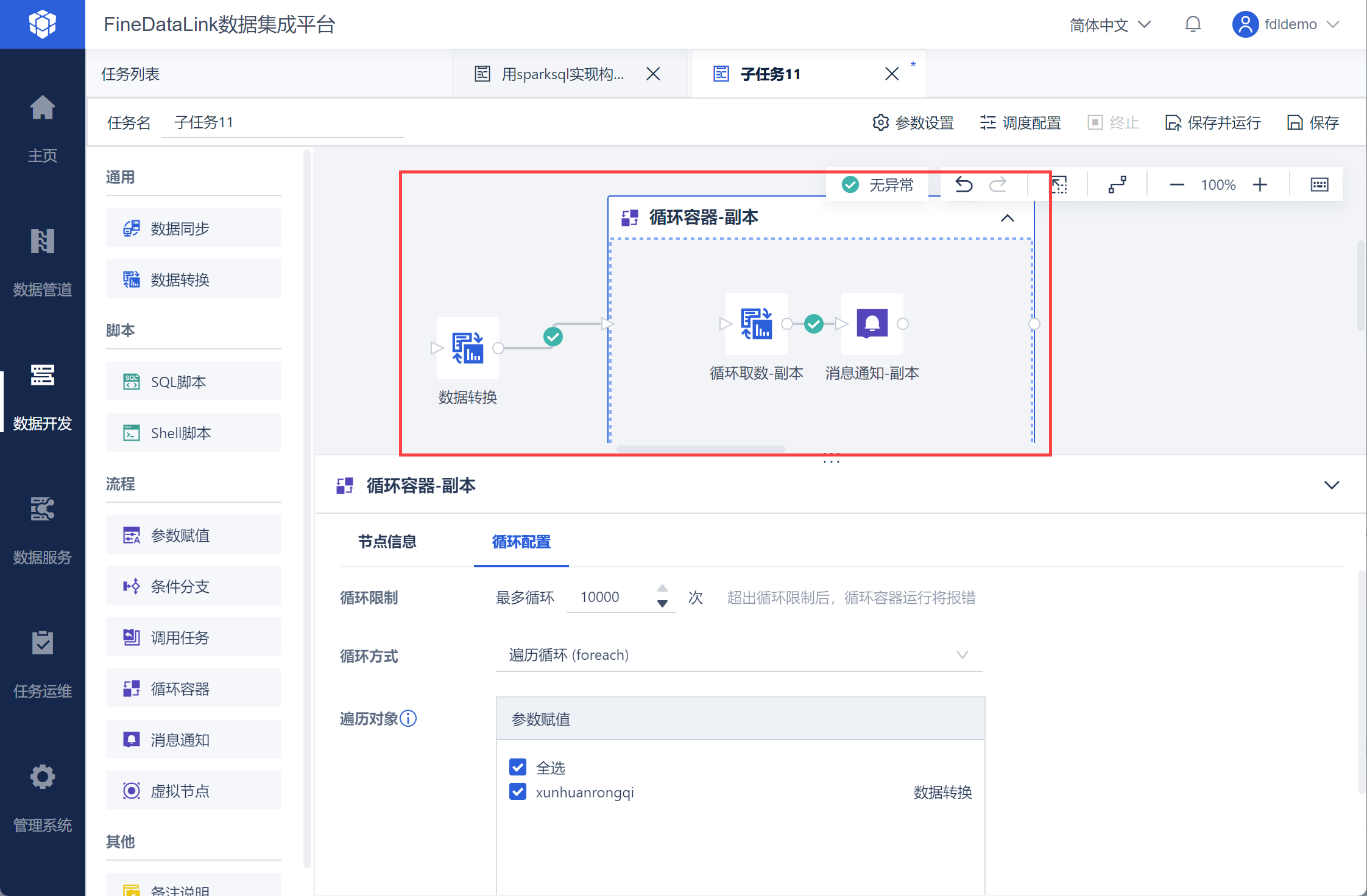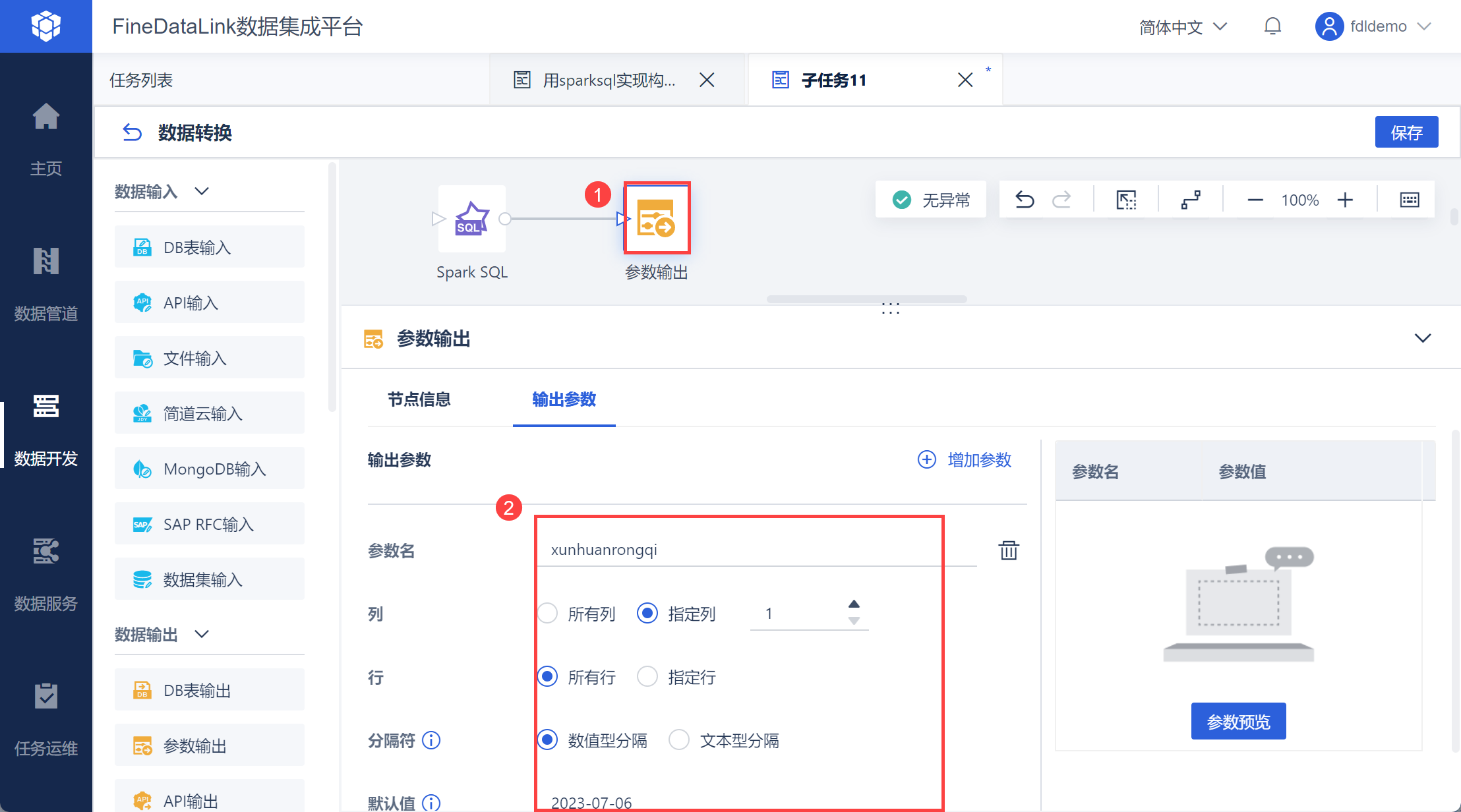 FineDataLink 中的数据处理过程,详情参见:https://demo.finedatalink.com/ 「使用SparkSQL构建日期列并循环取数1」。