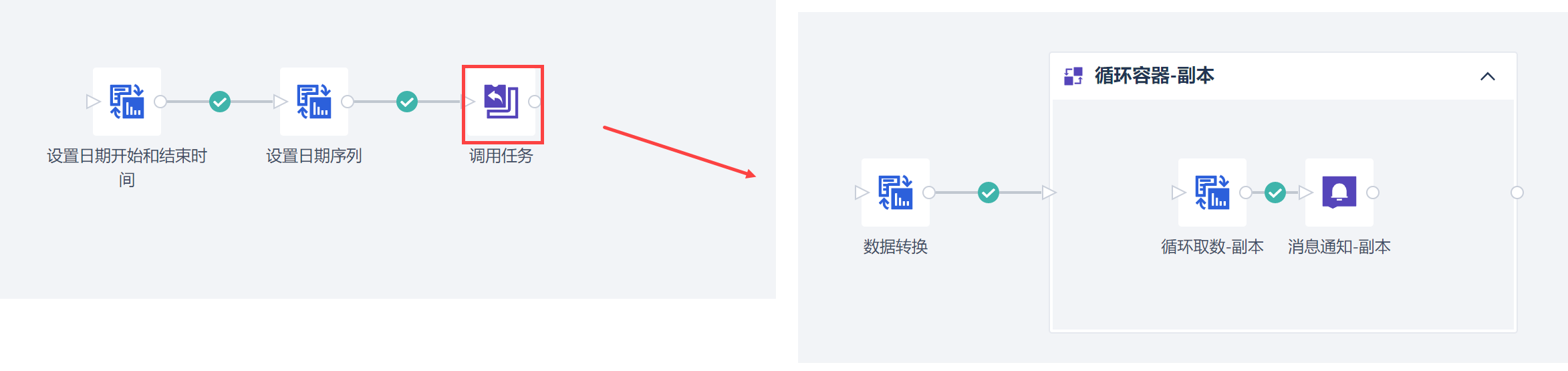 如果创建的日期序列参数需要被多个任务使用,则可以使用调用子任务的方式,将日期序列后的数据处理步骤单独设置为一个任务,调用该任务即可。