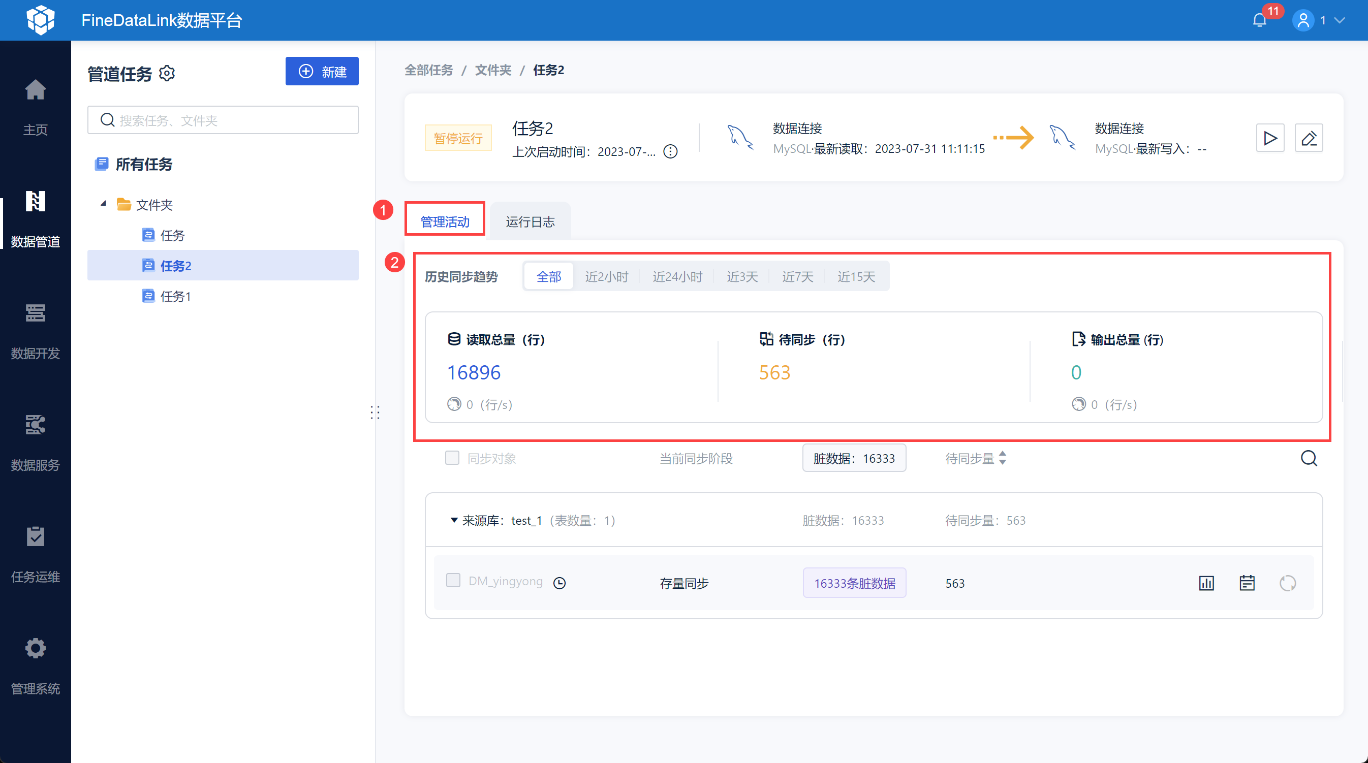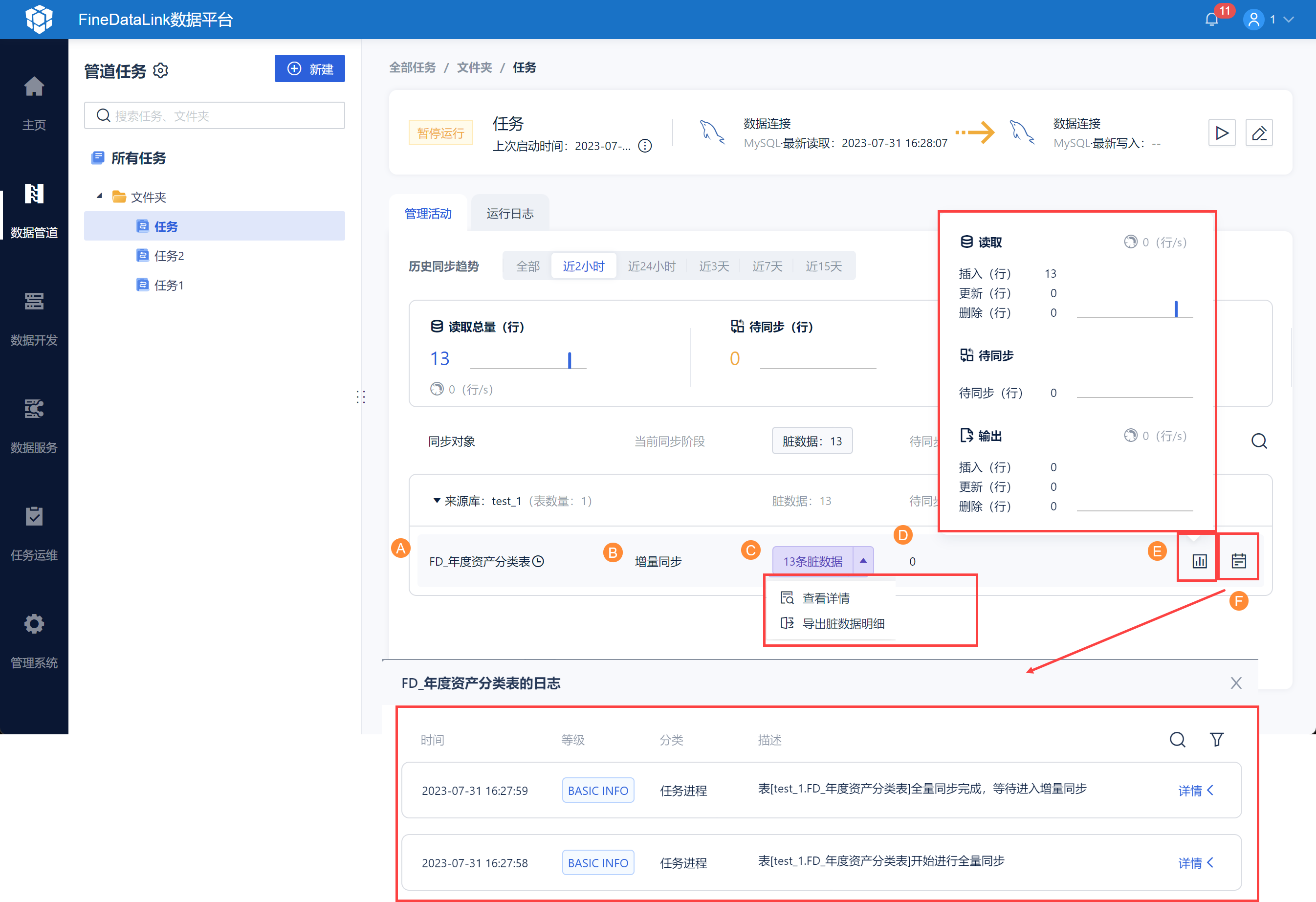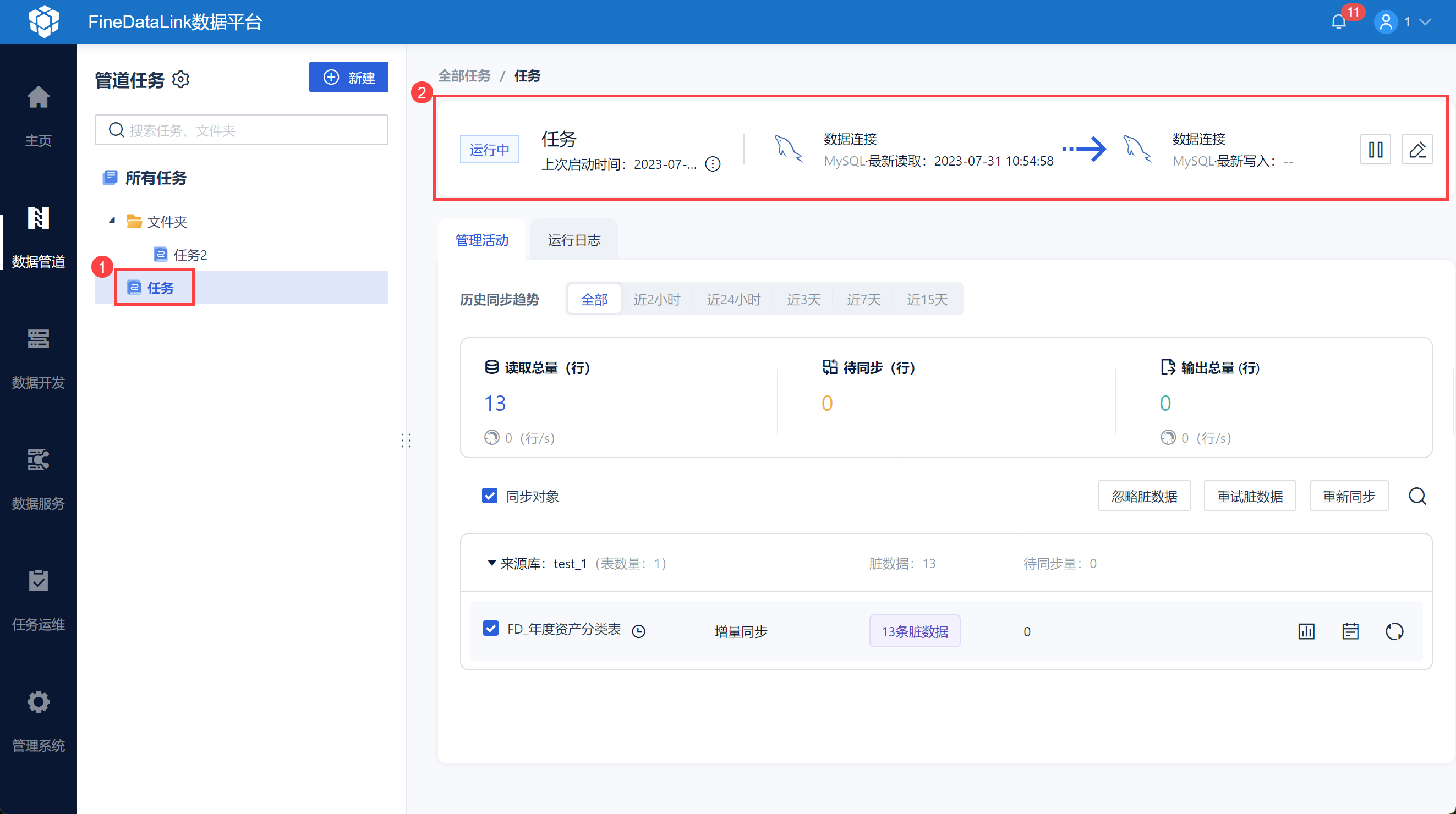 在设置好管道任务后,FineDataLink 支持对数据实时同步进行监控,查看任务运行情况,快速查看和处理脏数据。