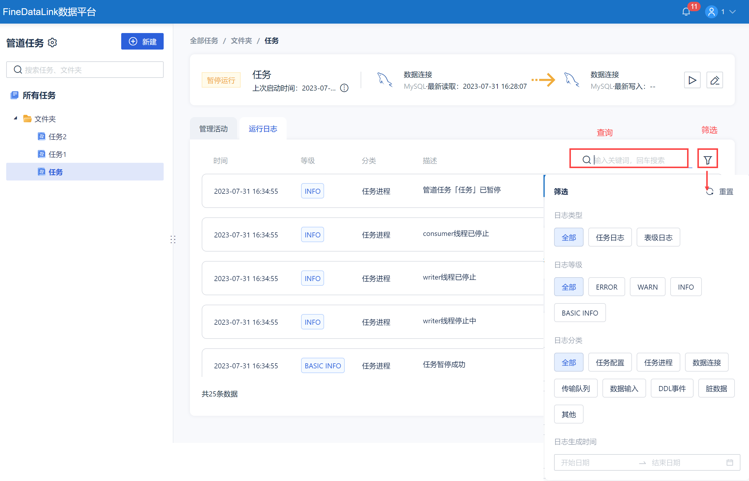注:支持根据任务筛选日志和根据表筛选日志,同时可以查看各种类型的日志;也可根据查看断点时间。