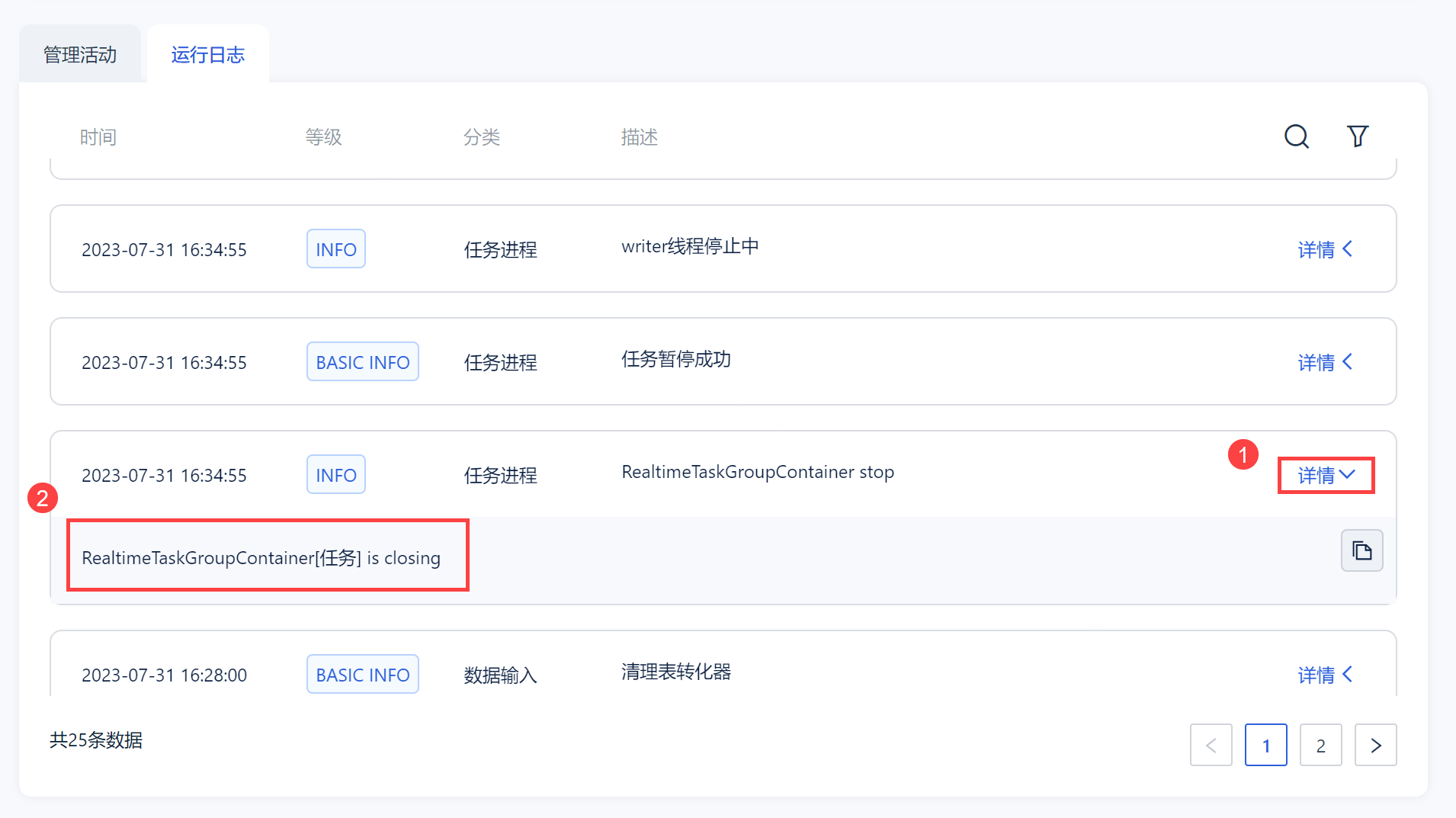 点击「运行日志」即可看到当前管道任务的历史运行日志记录,展示日志的时间、等级、分类、描述,如下图所示: