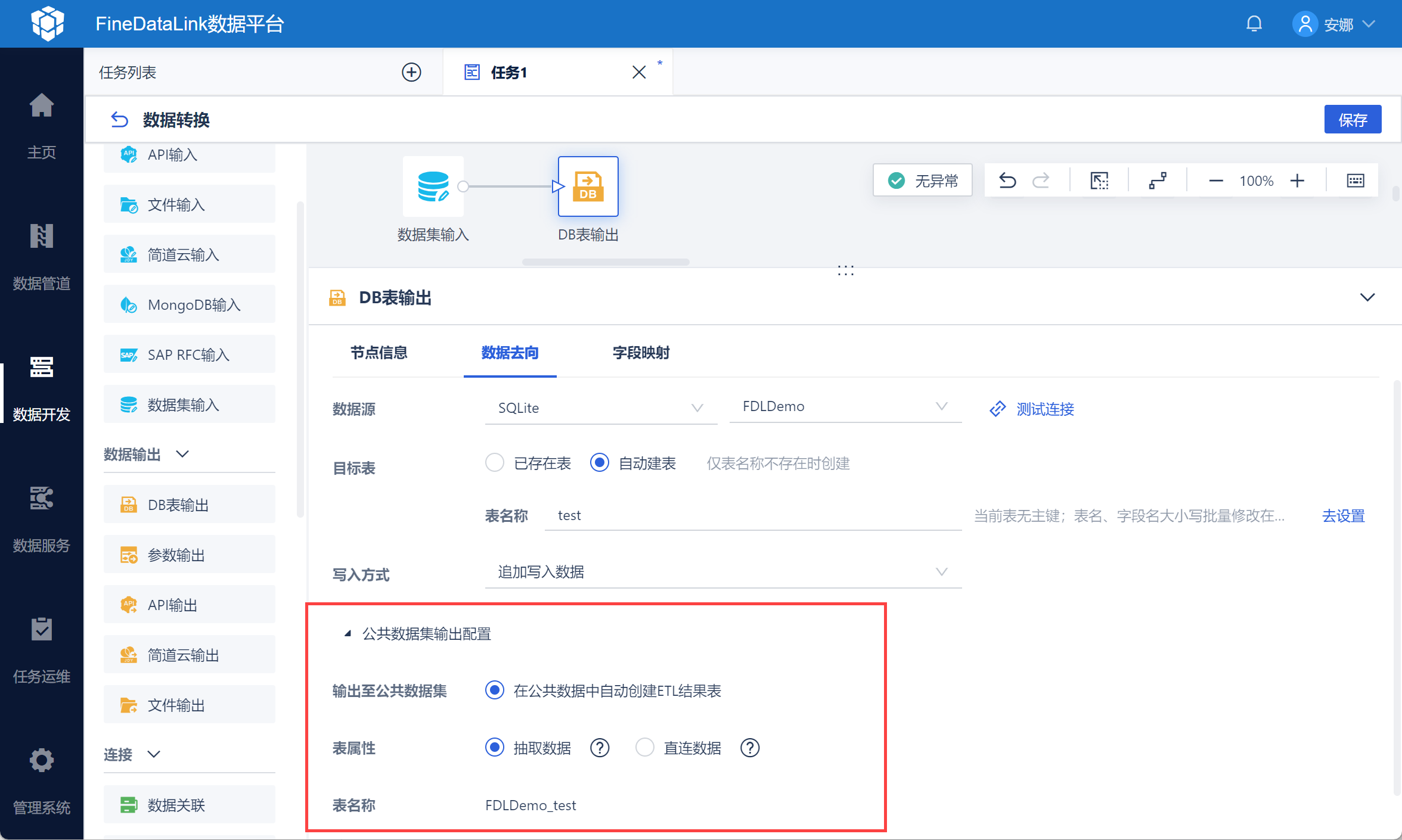 配置完成后,在 FineDataLink 定时任务的输出端勾选「在公共数据中自动创建ETL结果表」,并完成相应的输出配置,任务运行时将自动在FineBI 中创建一张 ETL 结果表。如下图所示: