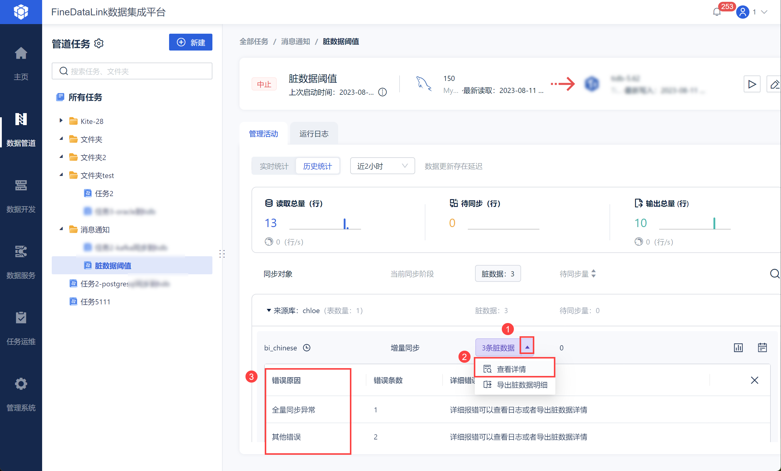 在设置好管道任务后,FineDataLink 支持对数据实时同步进行监控,查看任务运行情况,快速查看和处理脏数据。