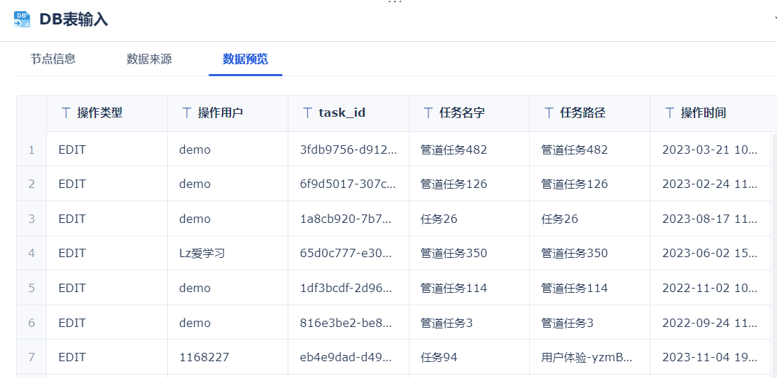 2)拖入「DB表输入」算子,取出 fine_dp_operate_history(任务操作历史记录表)中所需的字段。如下图所示: