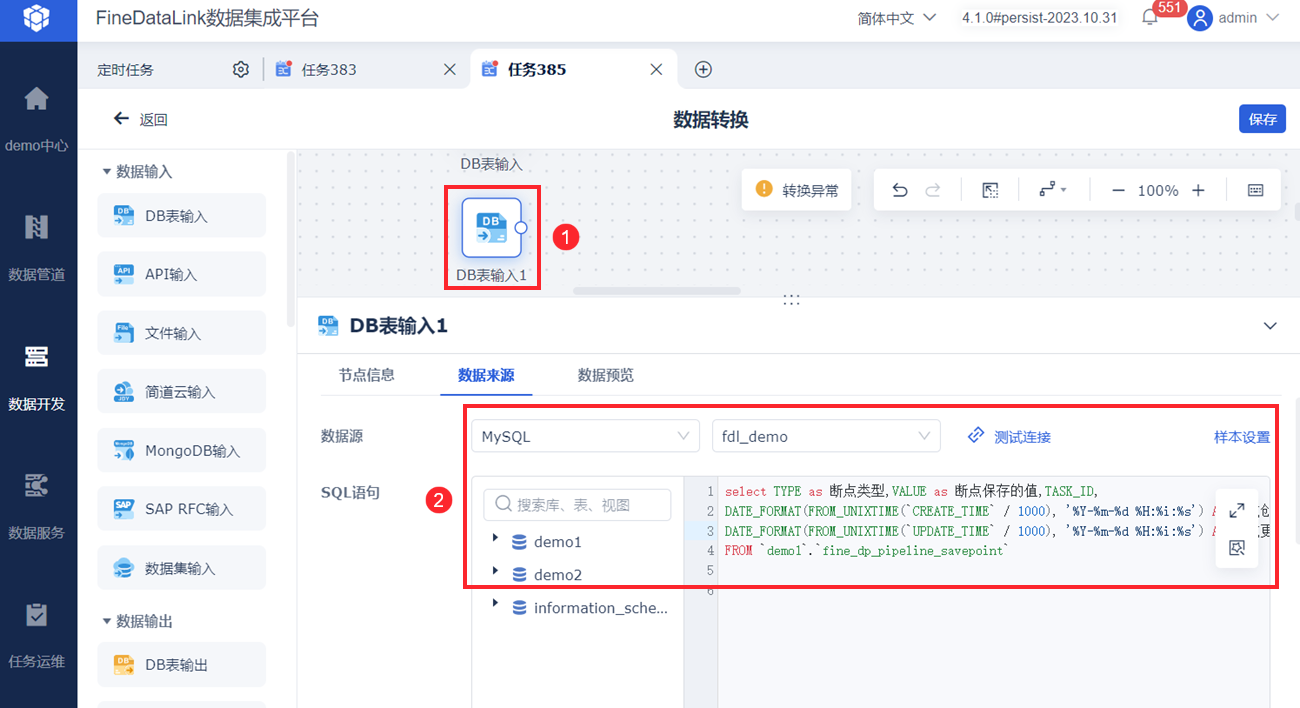 注:实际场景中,用户按需调整 SQL 语句,数据管道相关表情参考:管道任务