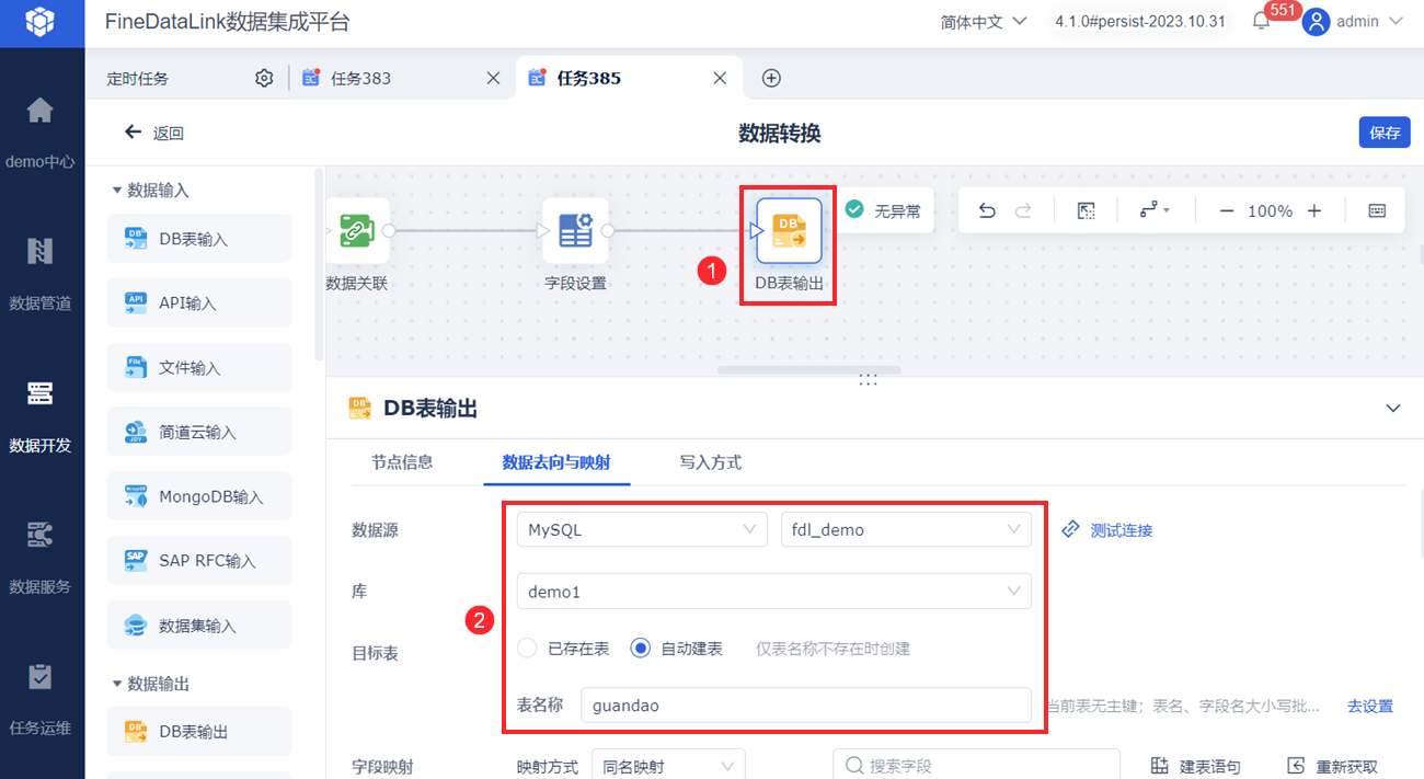 1)拖入「DB表输出」算子,将处理后的数据输出。如下图所示: