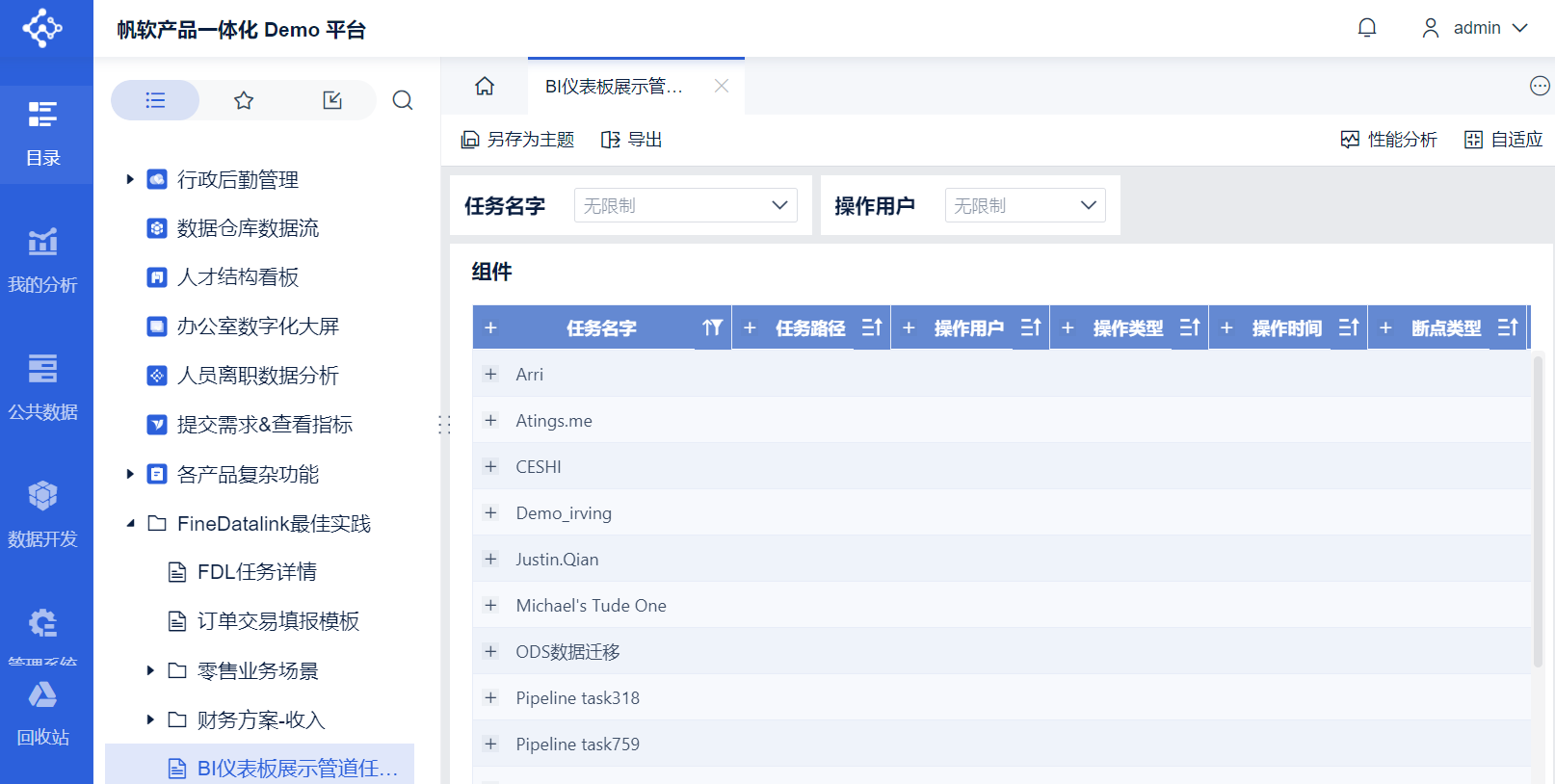 FineDataLink 中的数据处理过程,详情参见:https://demo.finedatalink.com/ 中的定时任务:「BI仪表板展示管道任务信息」