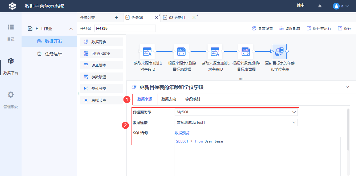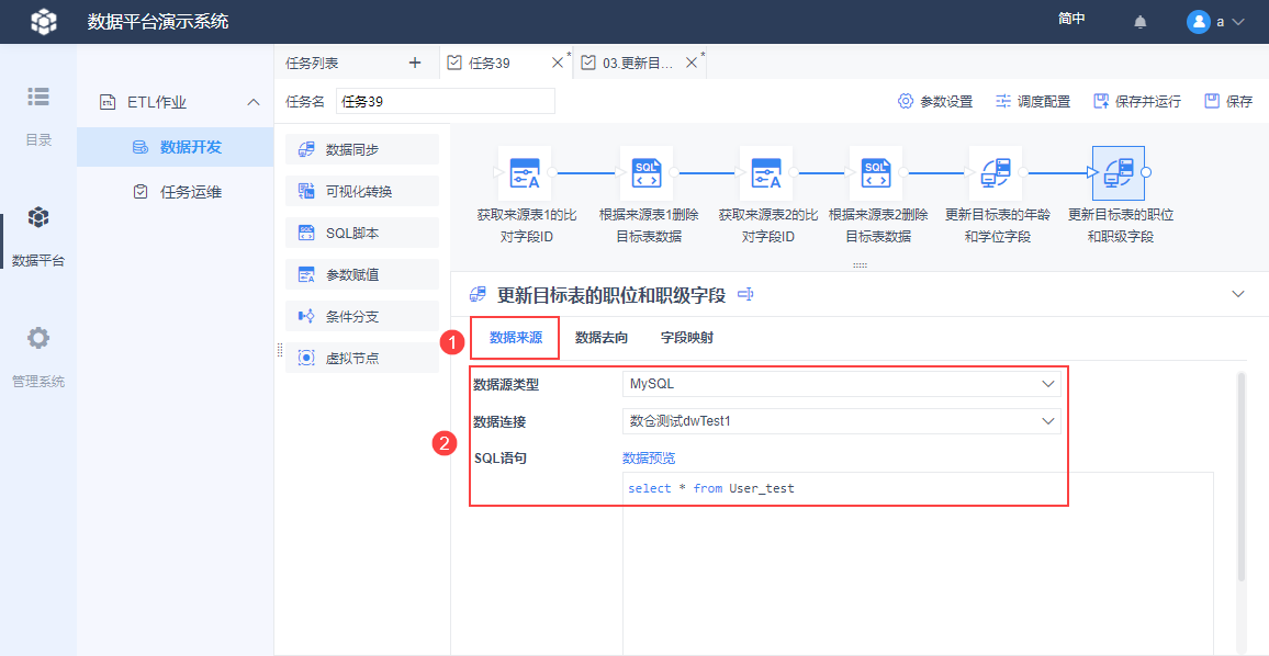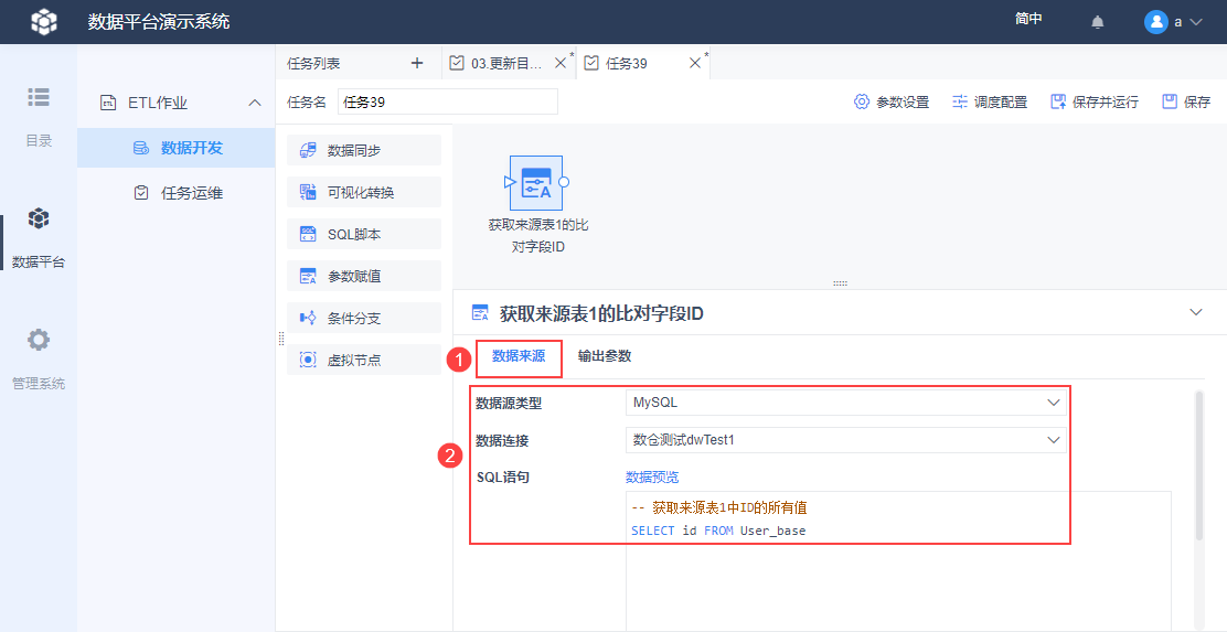 点击该节点,如下图设置数据来源,SQL 语句的作用是:获取来源表1中所有 ID 数据。