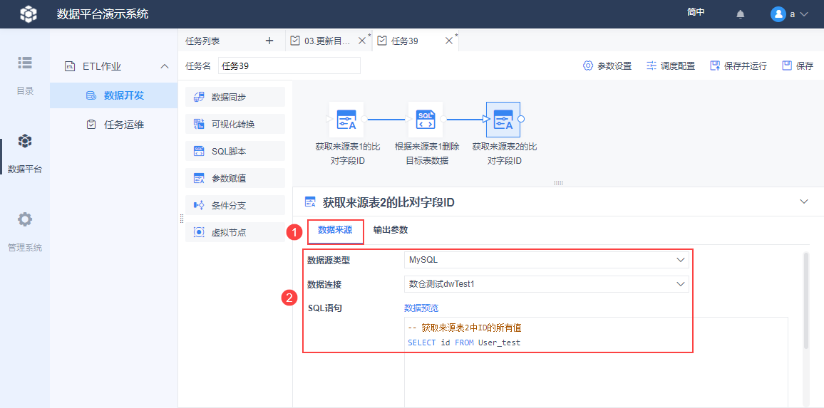点击该节点,如下图设置数据来源,SQL 语句的作用是:获取来源表2中所有 ID 数据。