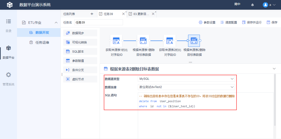 点击该节点,如下图设置,SQL 语句的作用是将目标表中存在但来源表2中没有的数据删除掉。