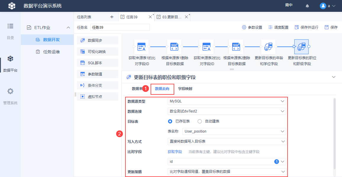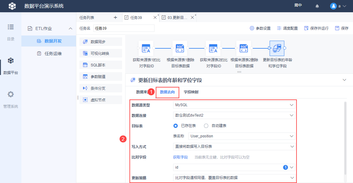 5)设置数据去向,将数据保存到目标表里,需要设置 id 为比对字段,更新策略为覆盖,如下图所示: