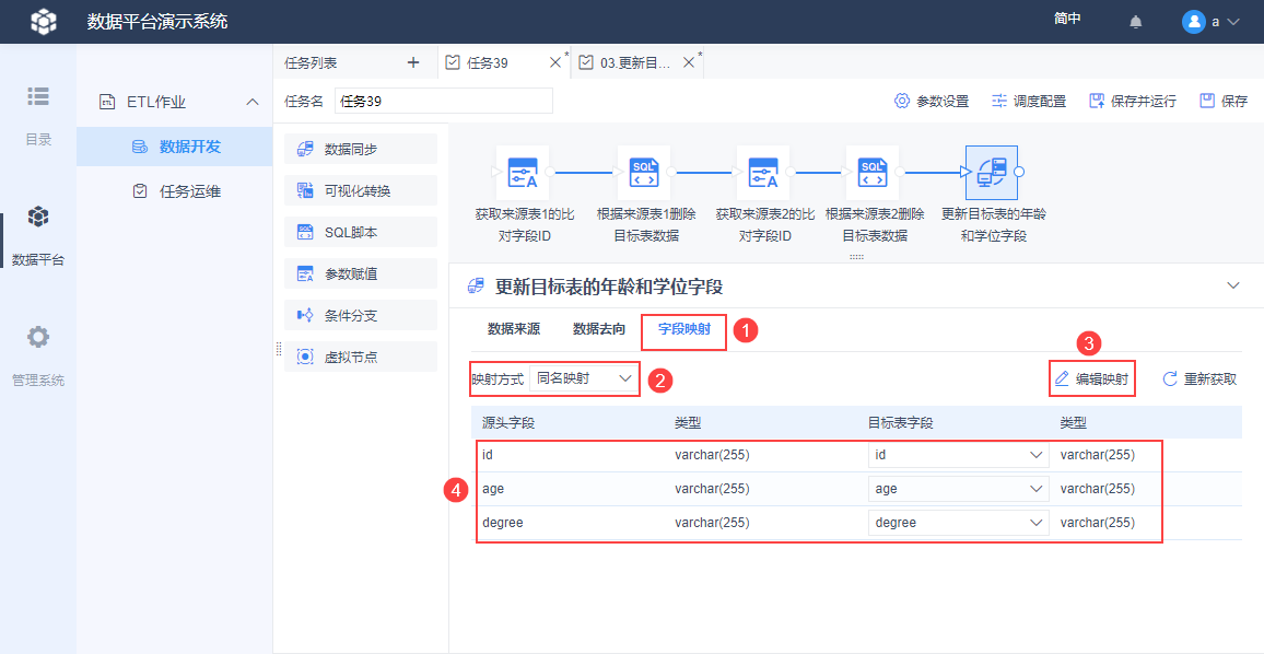 3)字段映射采用同名映射,且使用编辑映射删掉无关的映射字段,只保留 id、age、degree 这三个字段的映射关系。