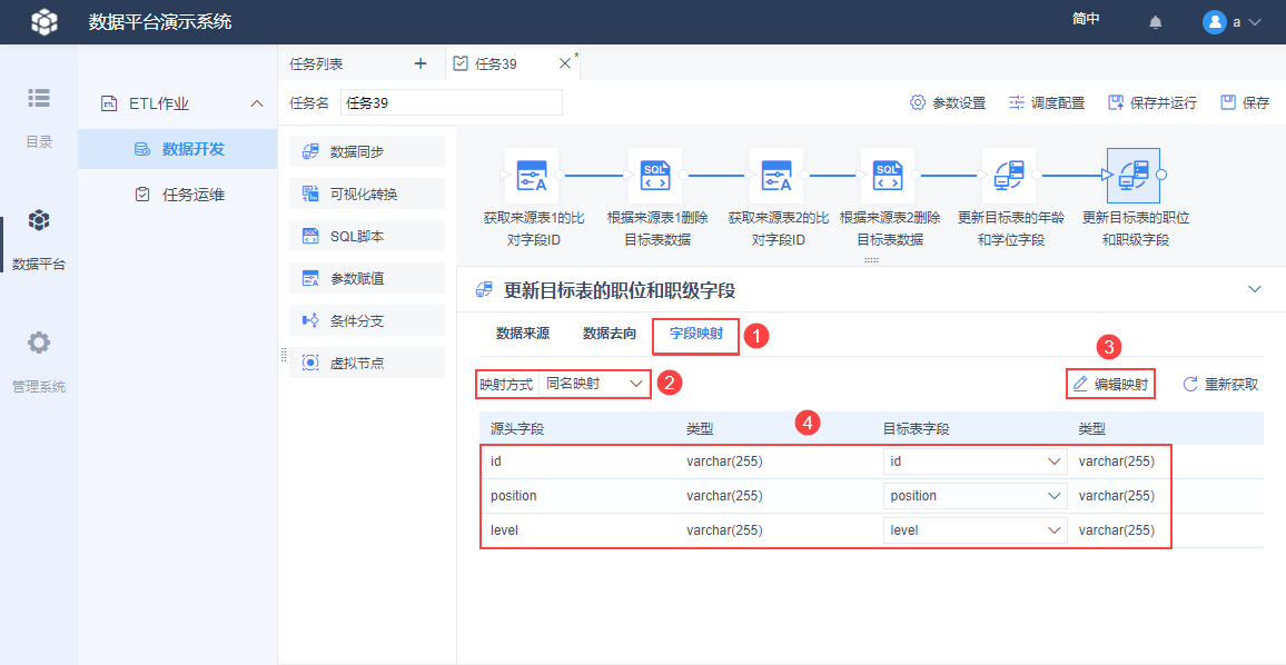6)字段映射采用同名映射,且使用编辑映射删掉无关的映射字段,只保留 id、position、level 这三个字段的映射关系。