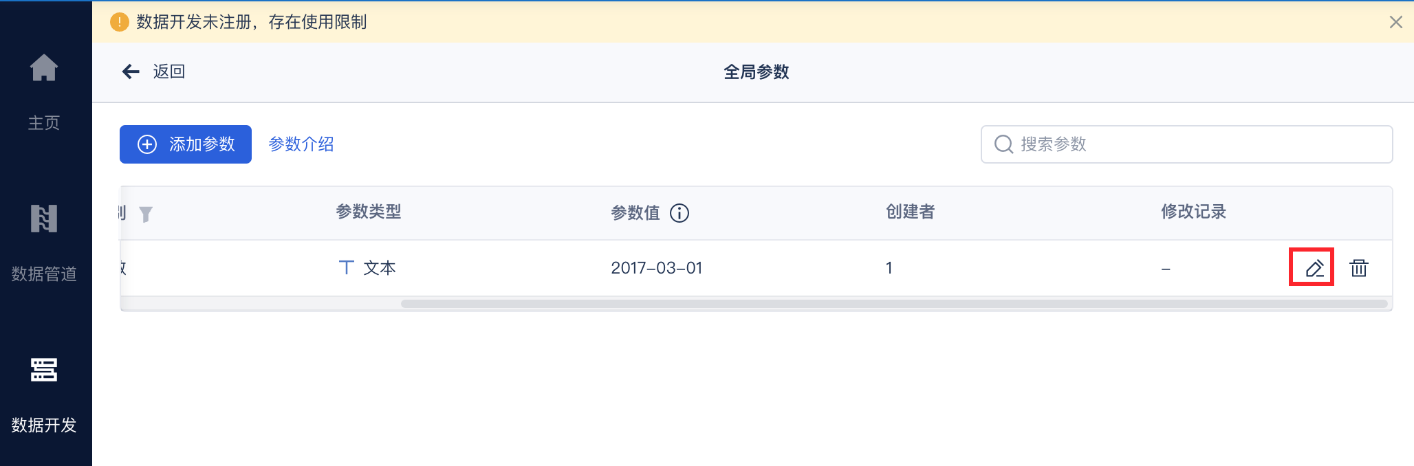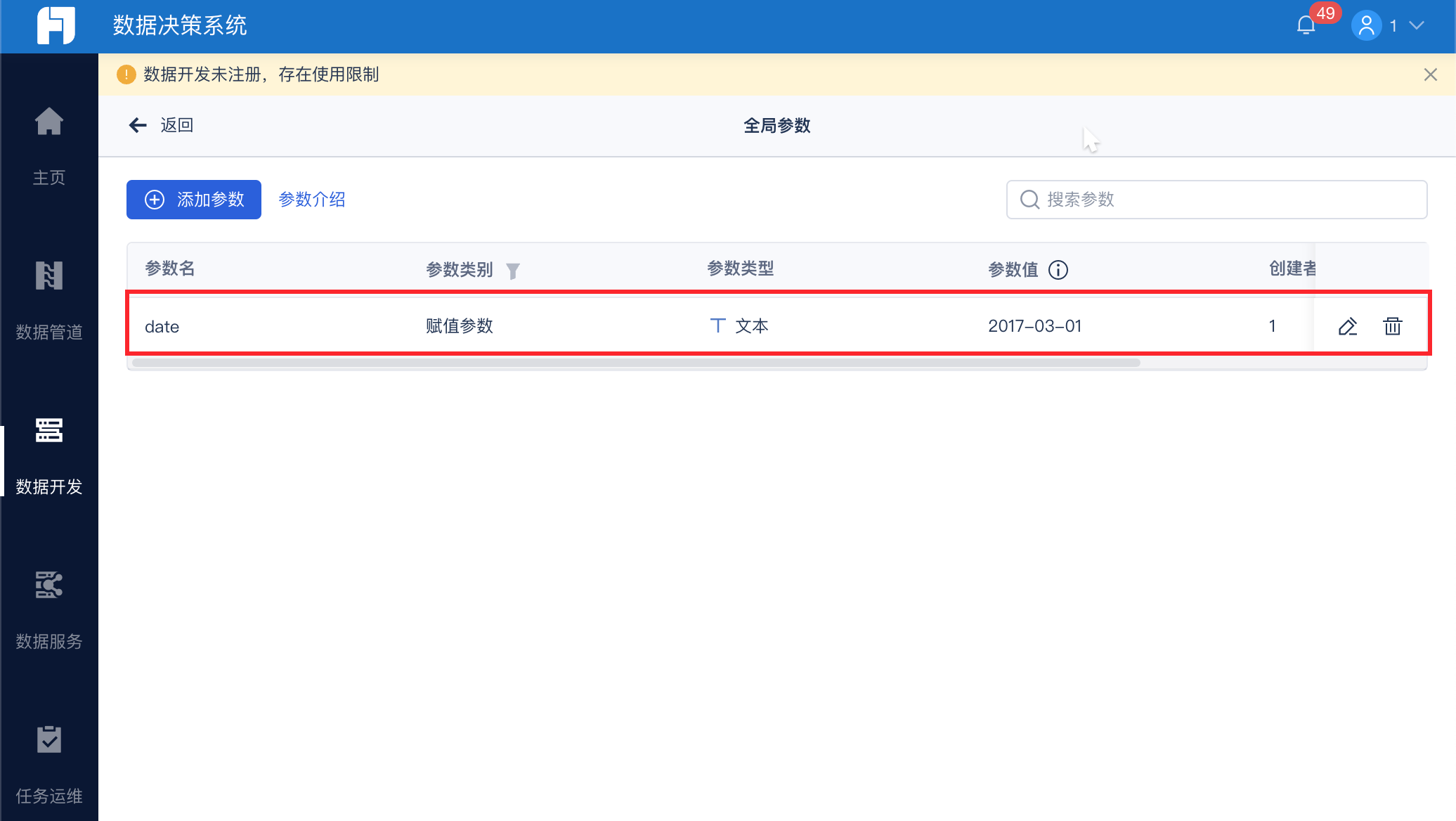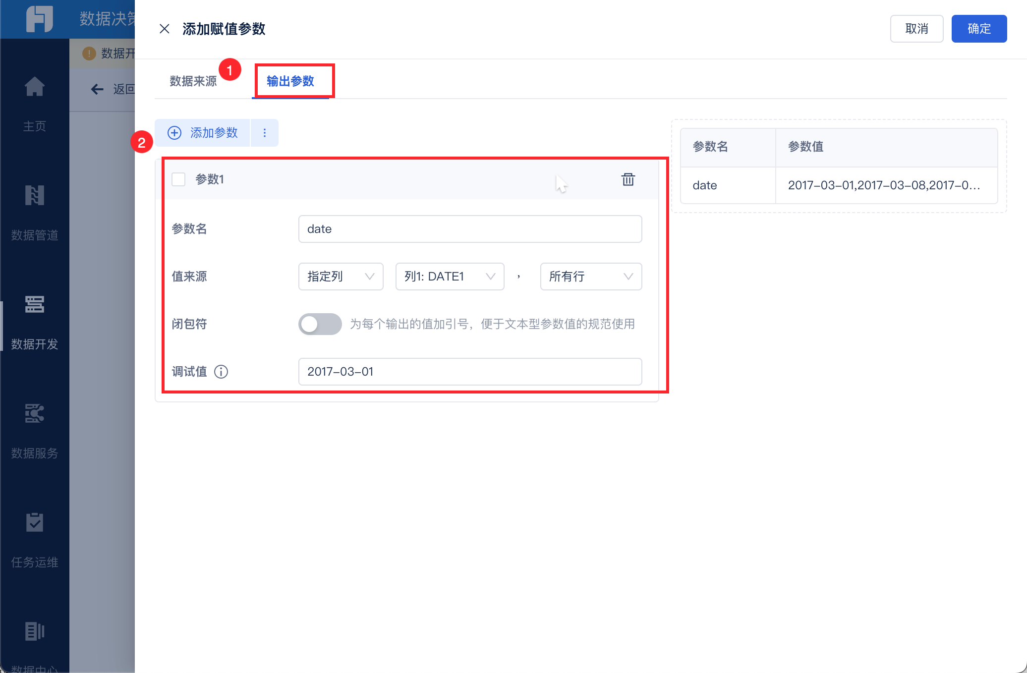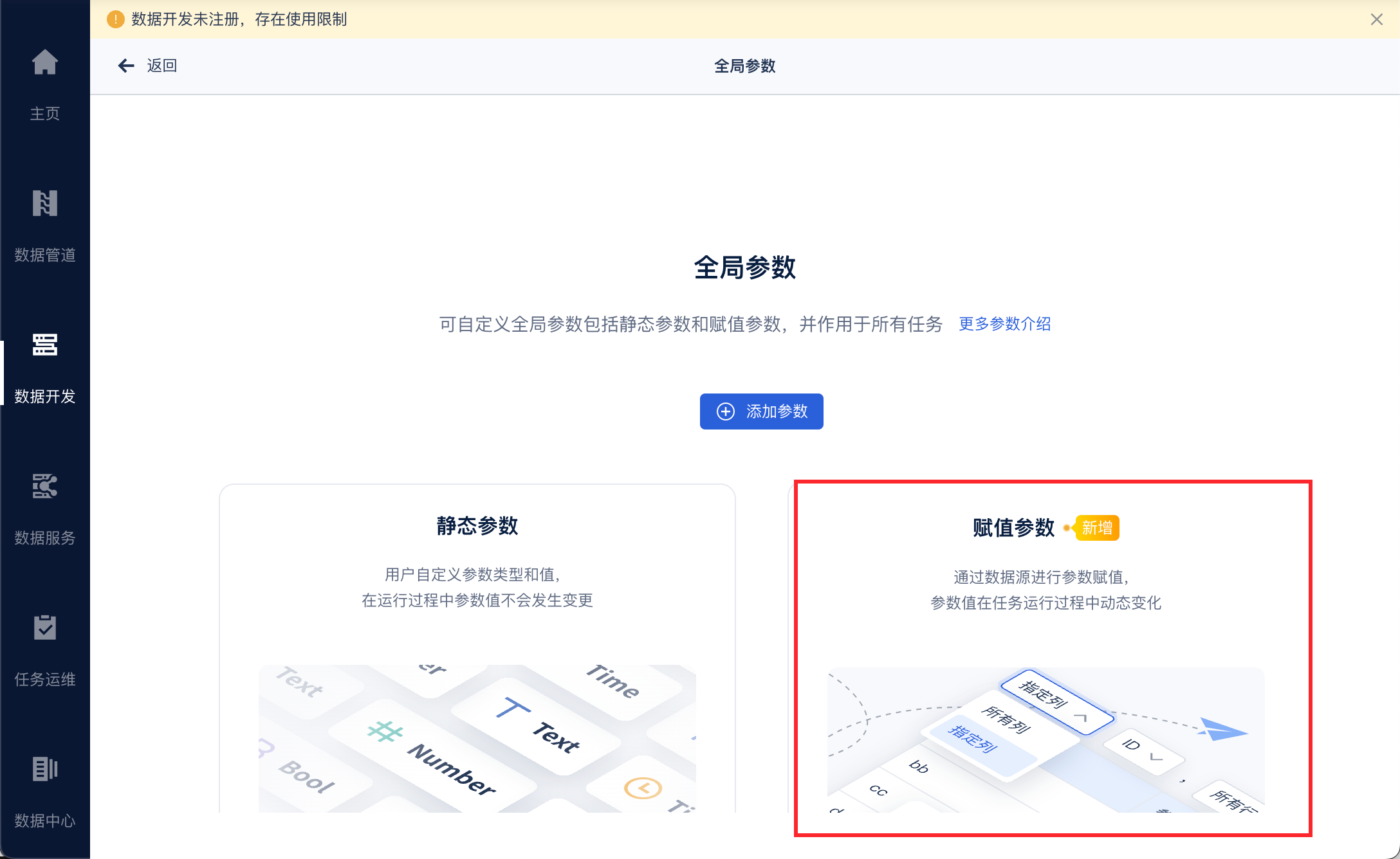 2)点击「添加参数」按钮,可添加全局赋值参数。例如希望从数据库取出一列时间作为参数,给多个定时任务使用。