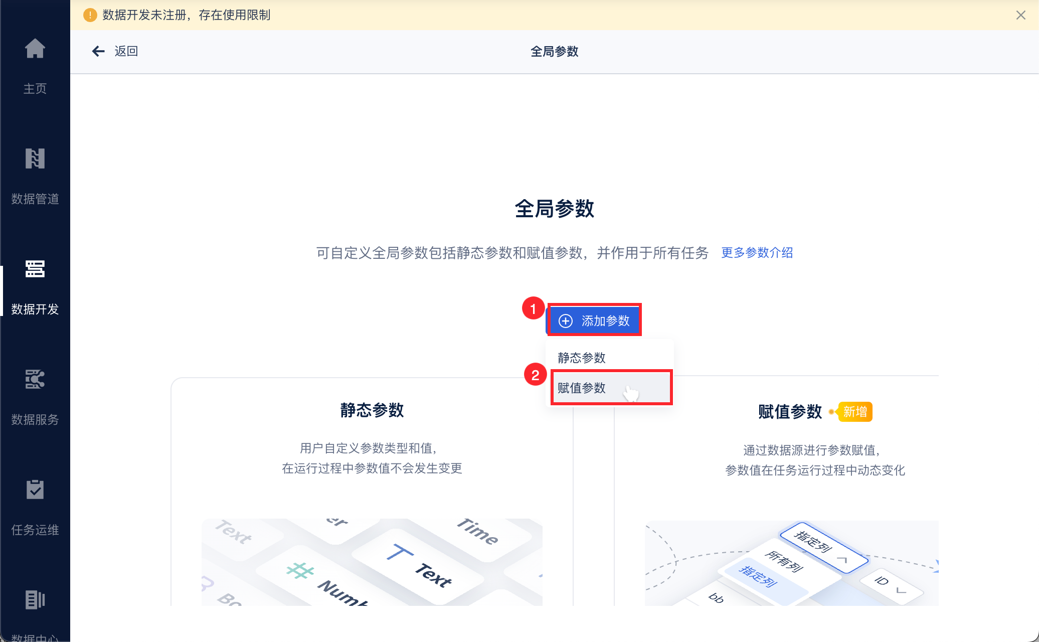 例如有一个「参数赋值」在多个定时任务中都用到了,不想在多个定时任务中都维护,希望添加一个全局赋值参数,在多个定时任务中使用。