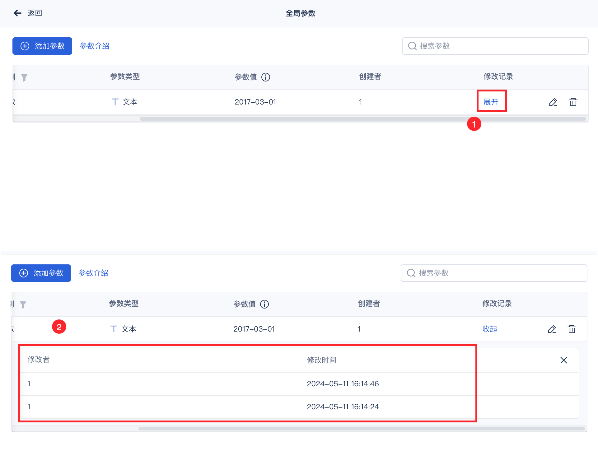 3)修改全局参数后,「修改记录」列点击「展开」按钮,可查看修改记录。如下图所示: