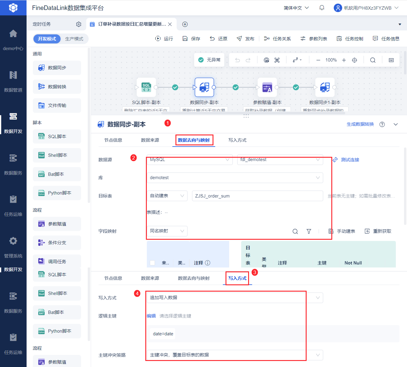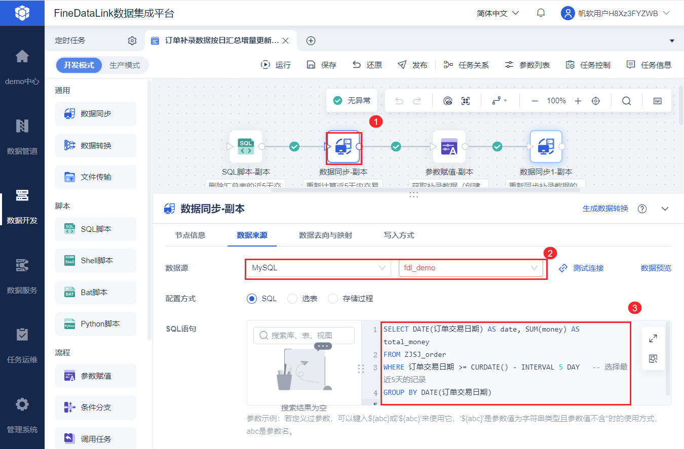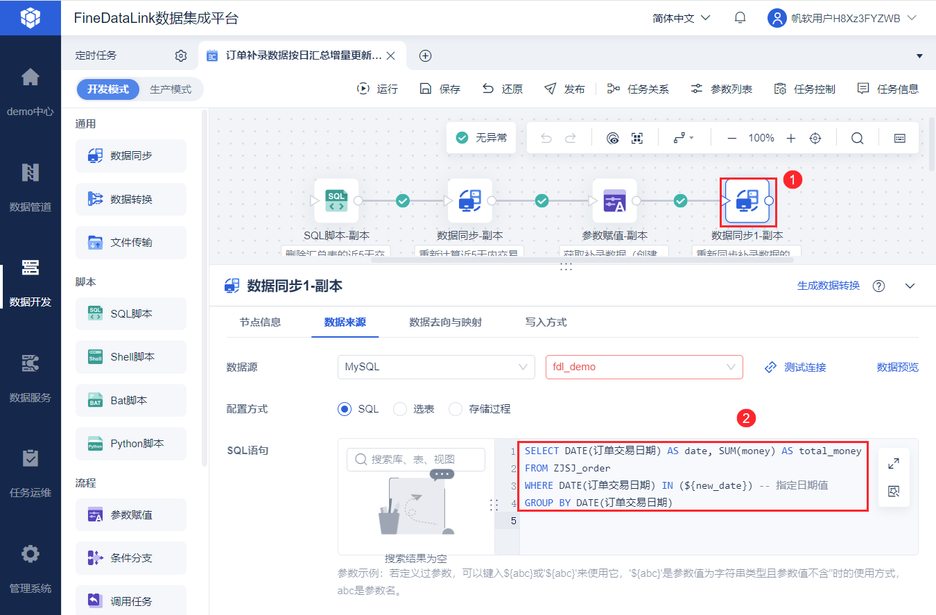 FineDataLink 中的数据处理过程,详情参见:https://demo.finedatalink.com/ 「订单补录数据按日汇总增量更新方案」。