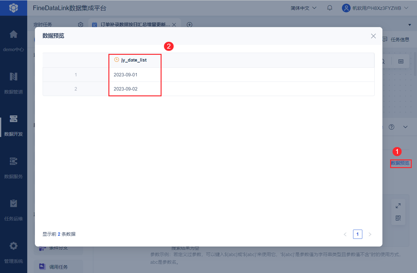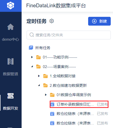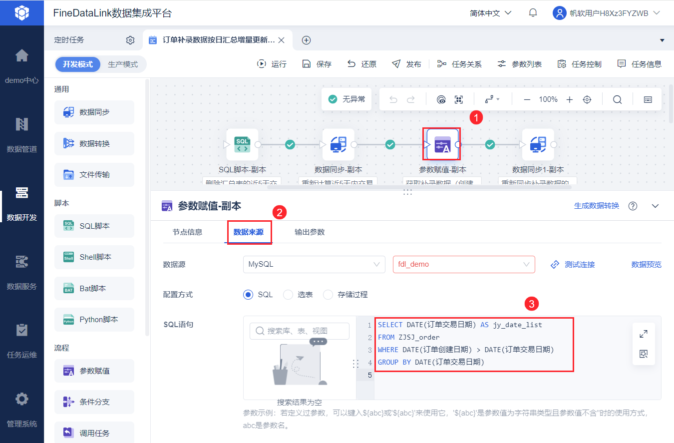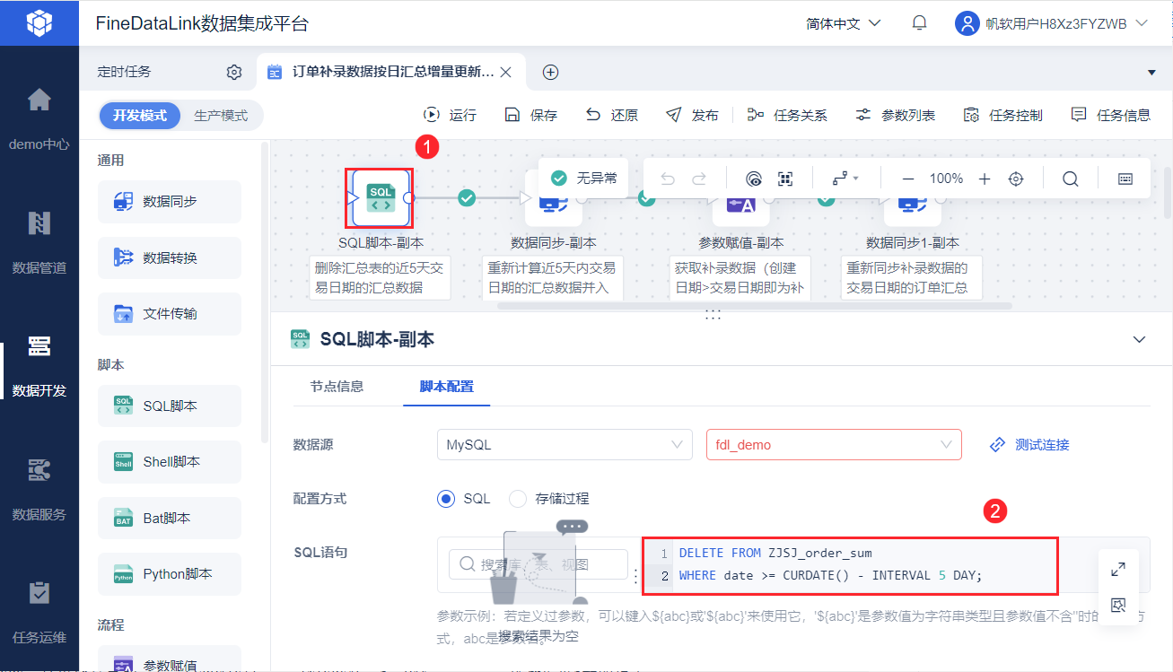 FineDataLink 中的数据处理过程,详情参见:https://demo.finedatalink.com/ 「订单补录数据按日汇总增量更新方案」。