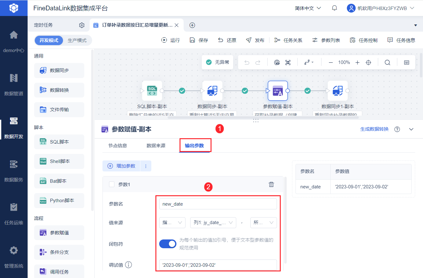 新增「参数赋值」,从 ZISJ_order 表中获取「订单创建日期」大于「订单交易日期」的数据,也就是筛选出补录订单的日期,如下图所示: