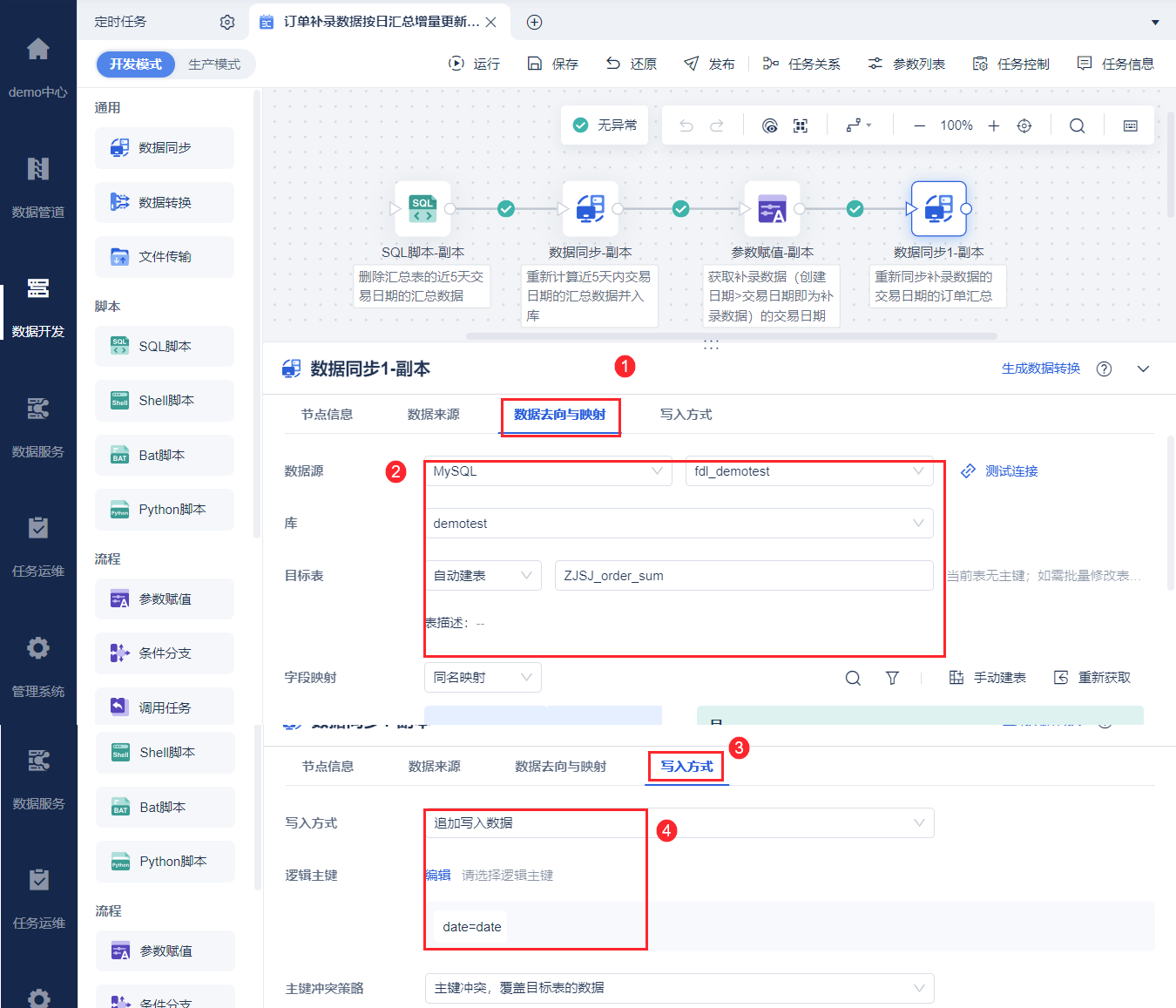 将数据写入汇总表,并设置写入方式为追加写入,同时当「订单交易日期」数据冲突时,写入的数据覆盖已有数据,实现增量数据更新,如下图所示: