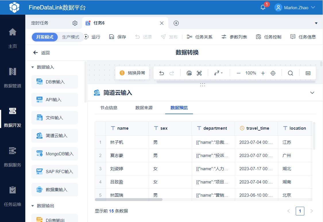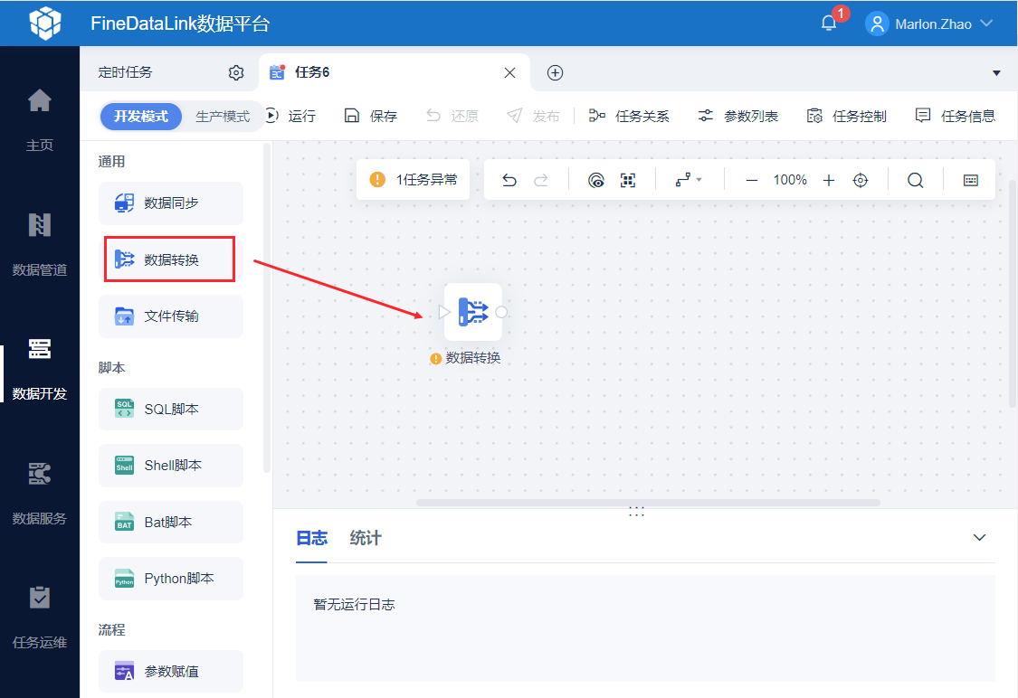 新建定时任务,拖入「数据转换」节点。如下图所示: