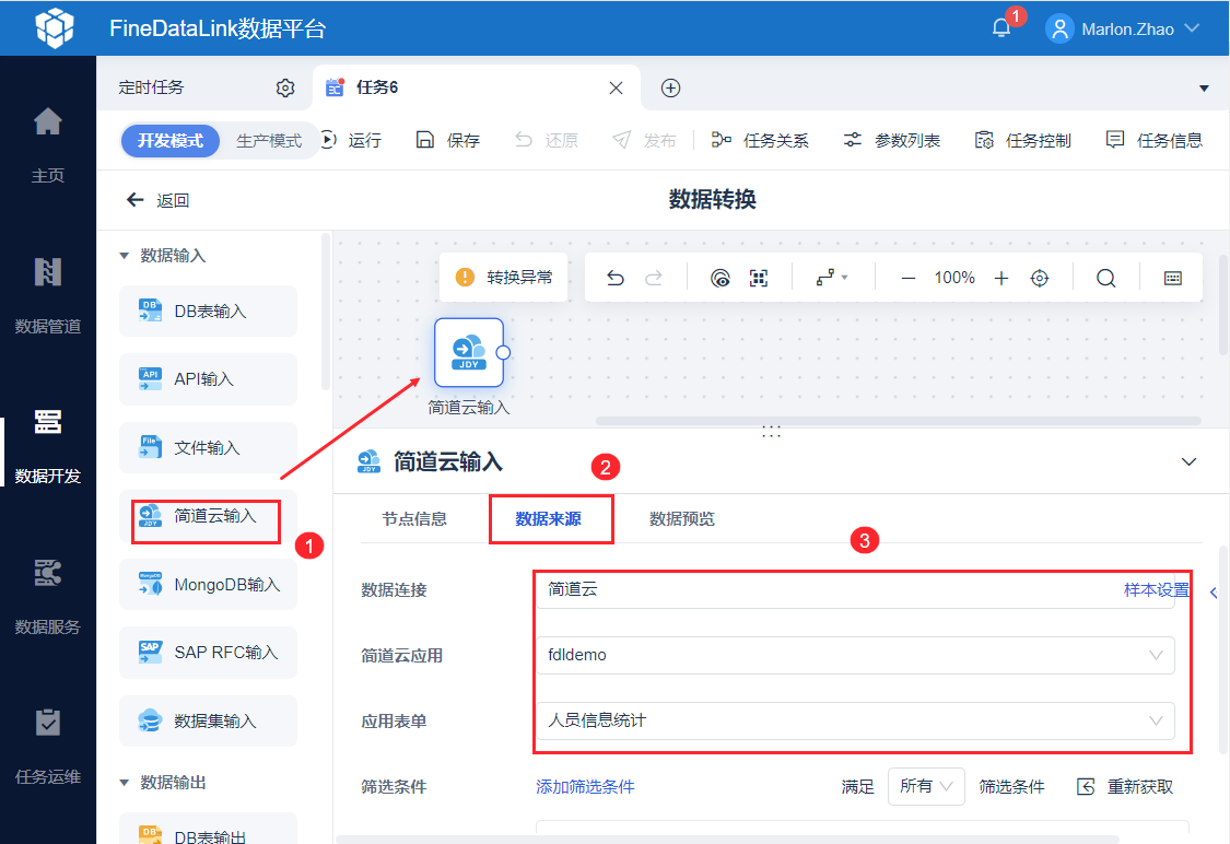 1)进入「数据转换」节点,拖入「简道云输入」算子,读取简道云表单数据。如下图所示: