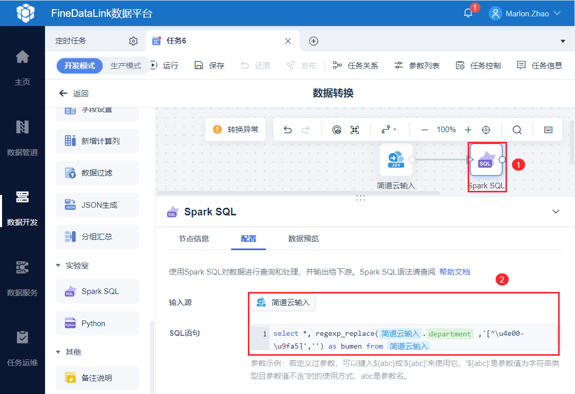 1)拖入「Spark SQL」算子,筛选出 department 字段中的汉字。SQL 语句为:select *, regexp_replace(简道云输入.department ,'[^\u4e00-\u9fa5]','') as bumen from 简道云输入