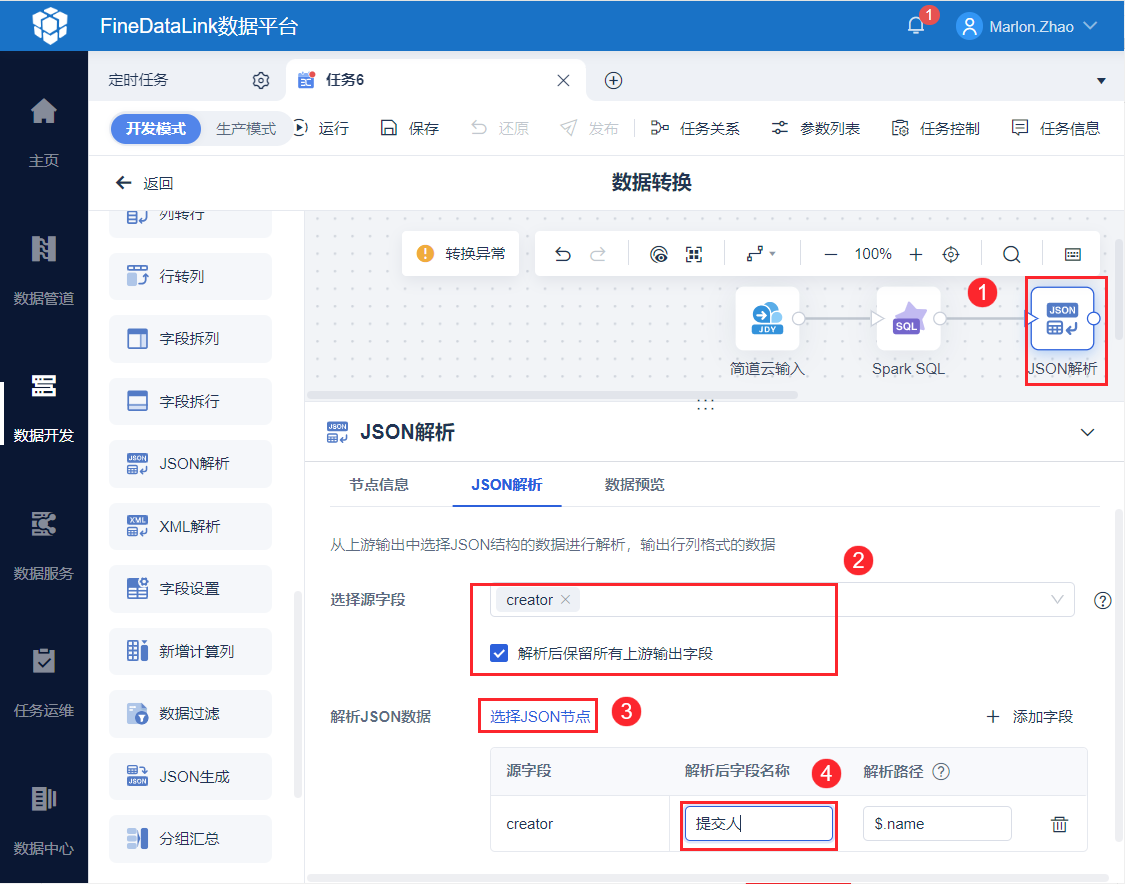 1)由于我们要把出差表单落库,需要将填写表单的用户信息解析出来。其中,需要勾选「解析后保留所有上游输出字段」,若不勾选该按钮,解析后只有 creator 字段解析后的数据;JSON 节点选择 name 字段;解析后字段名称修改为提交人。如下图所示: