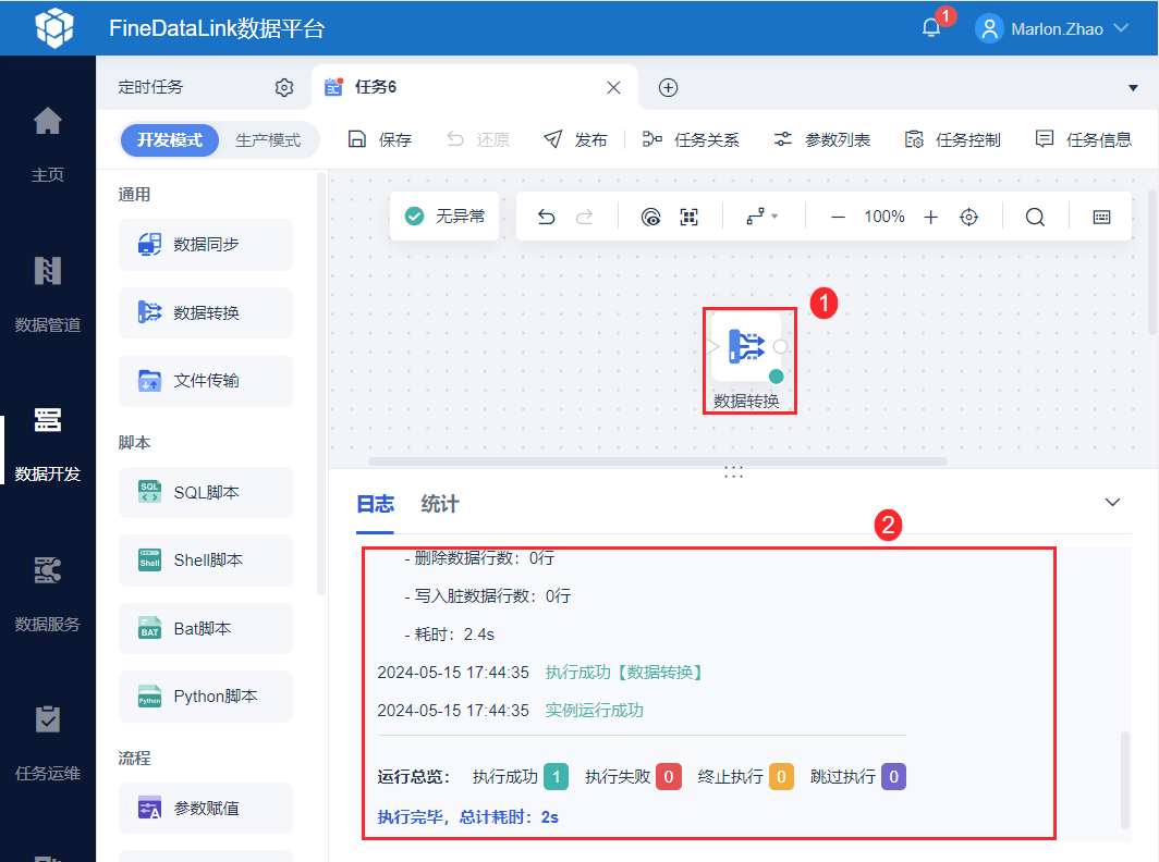 1)点击「保存并运行」按钮,任务运行成功后,如下图所示: