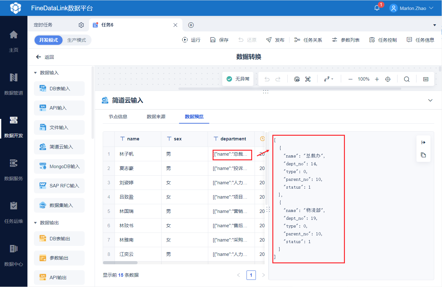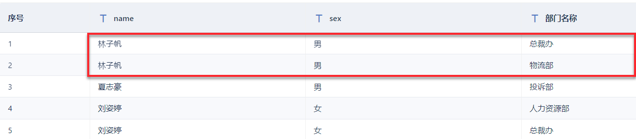 若使用「JSON 解析」算子直接解析该字段,一个人有多个部门时,数据将会被拆成多行,例如:
