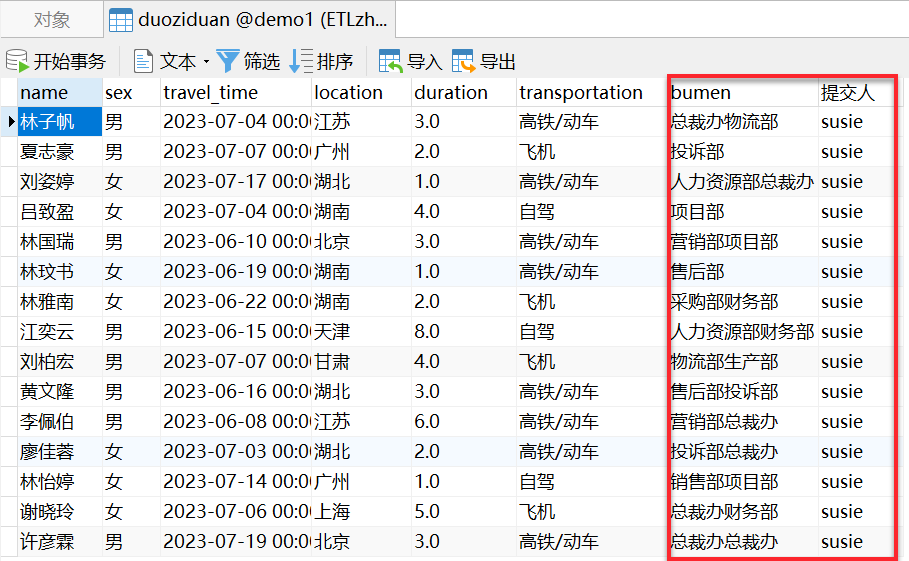因此本文使用 regexp_replace 函数提取 department 字段中的中文即可,将部门名称提取出来。
