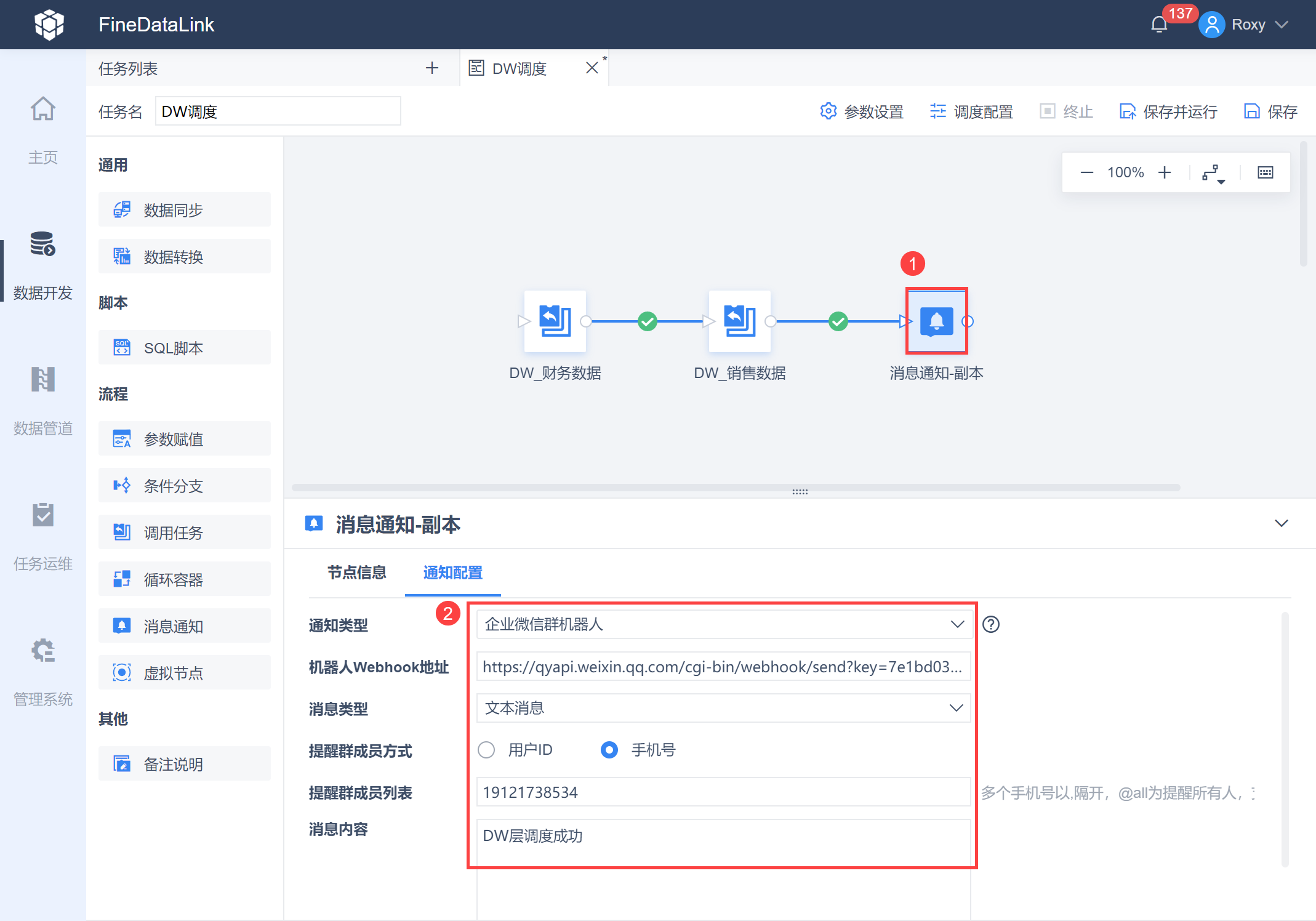 然后设置消息通知,当DW_财务数据任务执行成功,则发送通知,如下图所示: