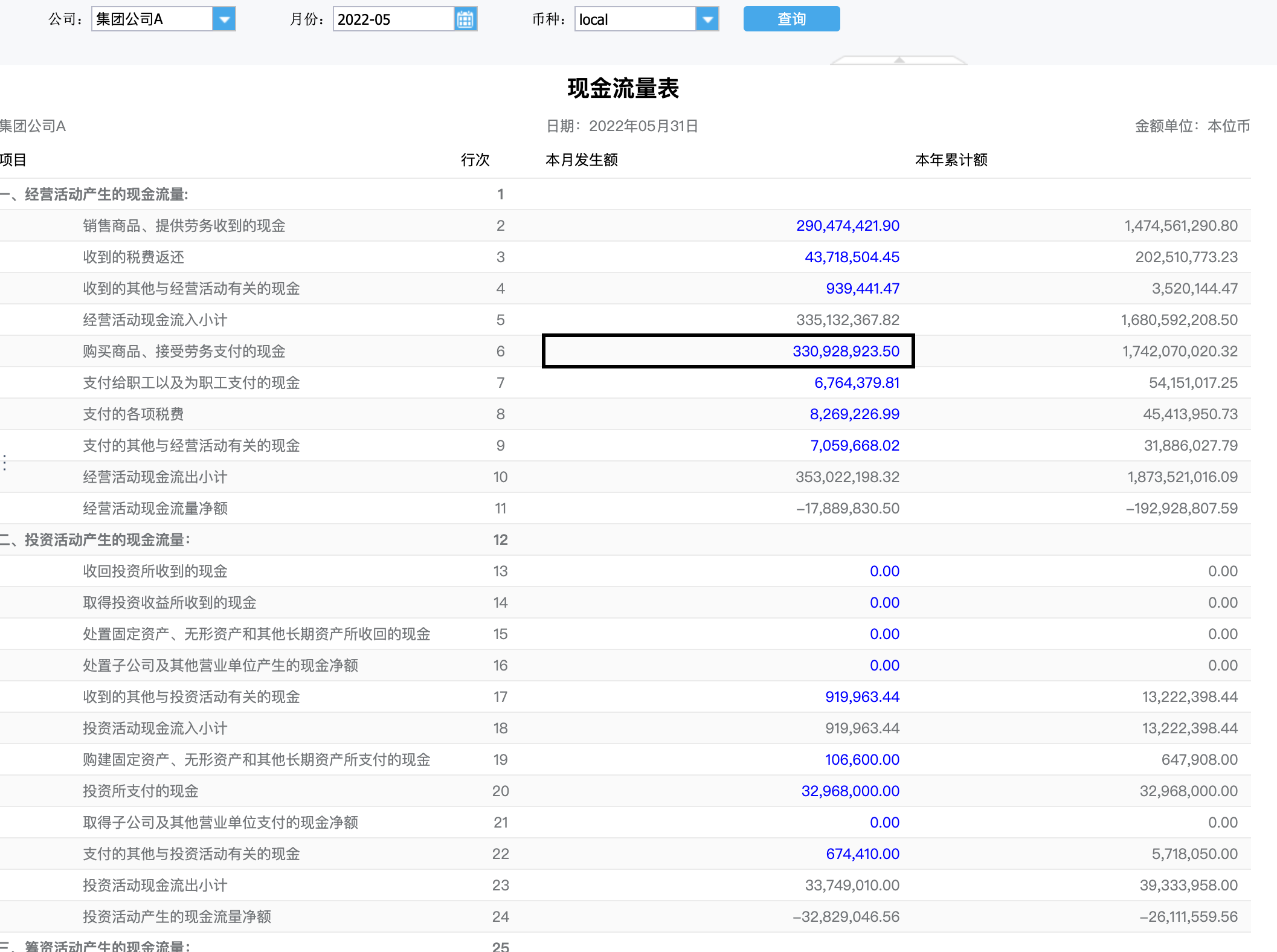 上述驾驶舱中的现金流量表打开,即可查询到按照公司、日期、币种为查询条件的单体公司现金流量表。