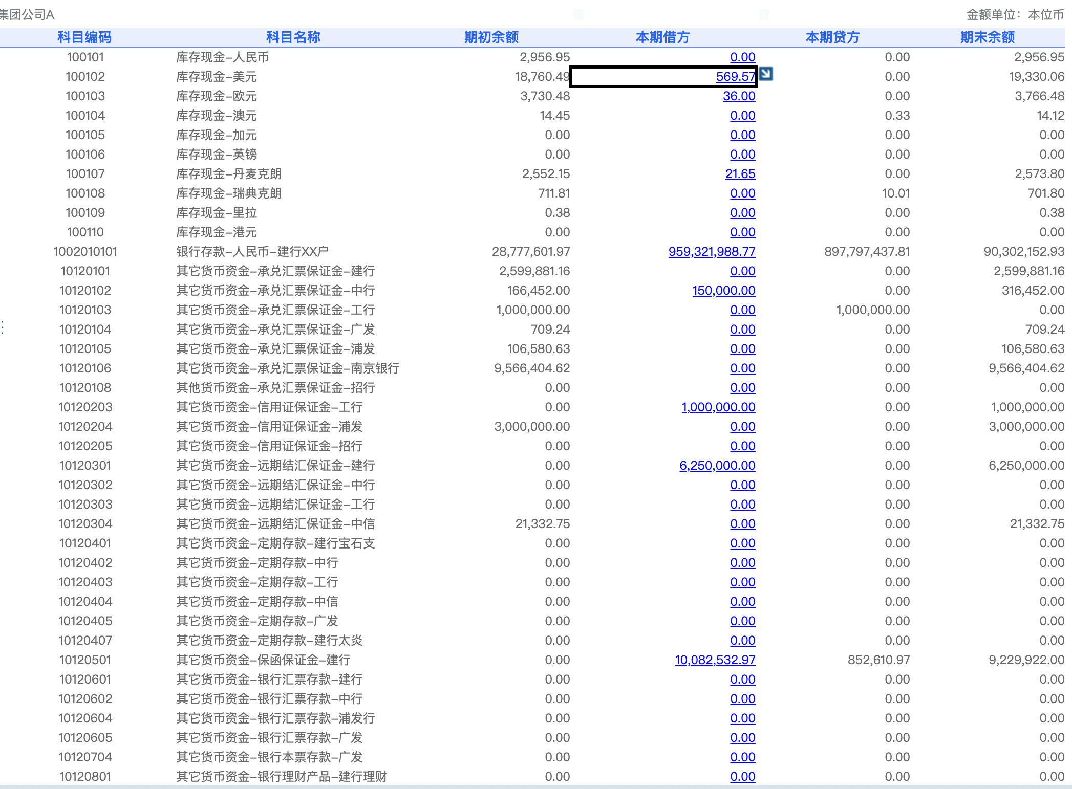 上述现金流量点击具体的数据可钻取到科目余额表,如下图所示。对更加明细的科目维度、指标进行展示。