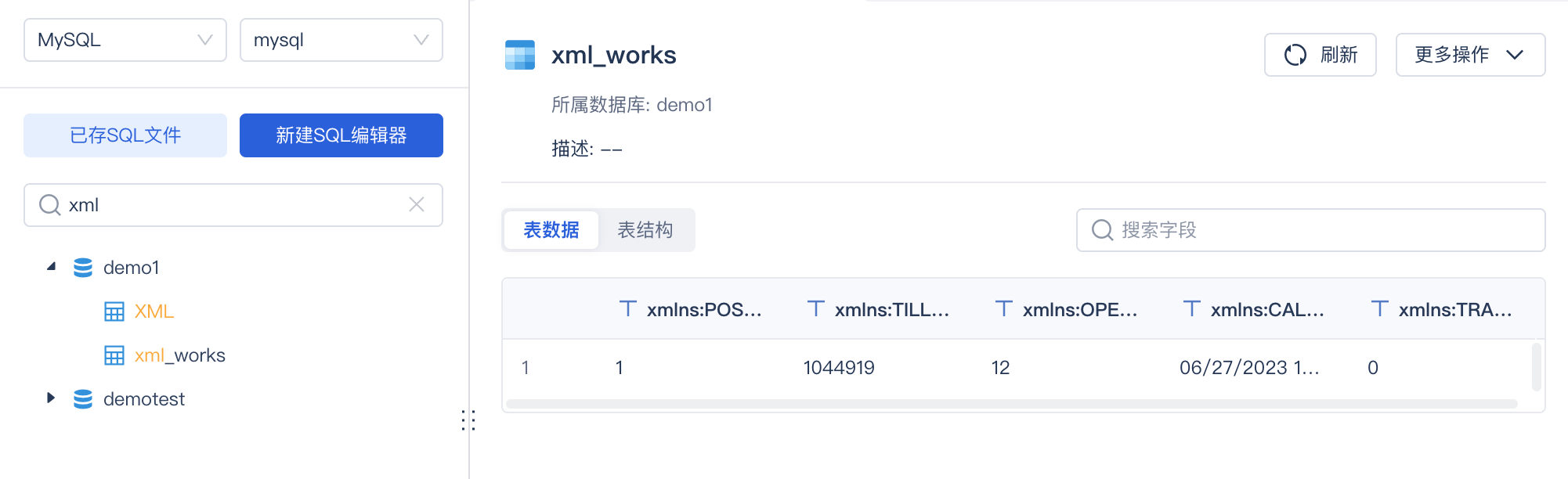 保存并运行任务后,即可在数据库中看到落库的 XML 文件数据,如下图所示: