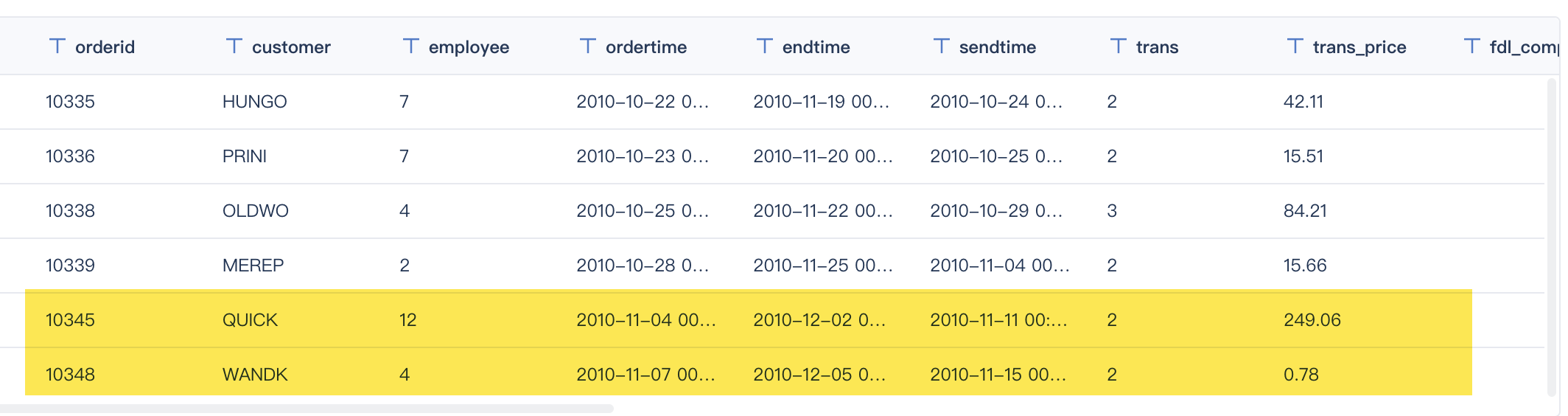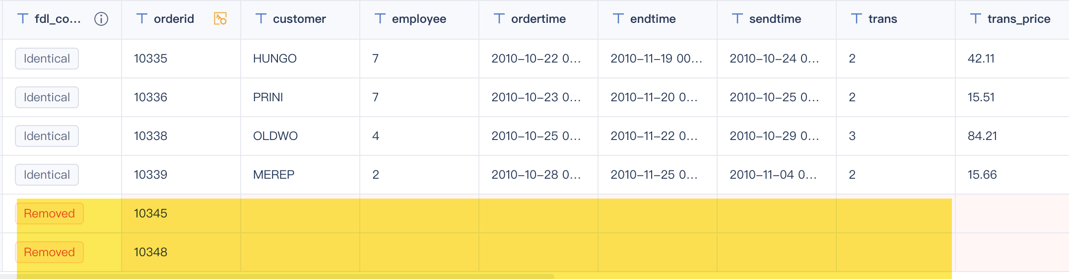 来源表中删除了 orderid 为10345、10348 的数据,希望目标表中这两条数据也删除。