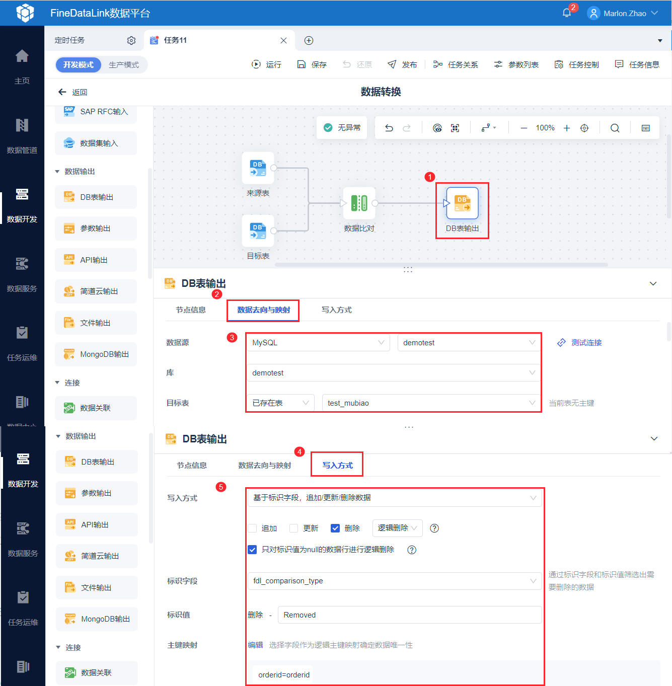 「DB表输出」算子与「数据比对」算子配合使用,可完成增量插入、删除、更新的操作。