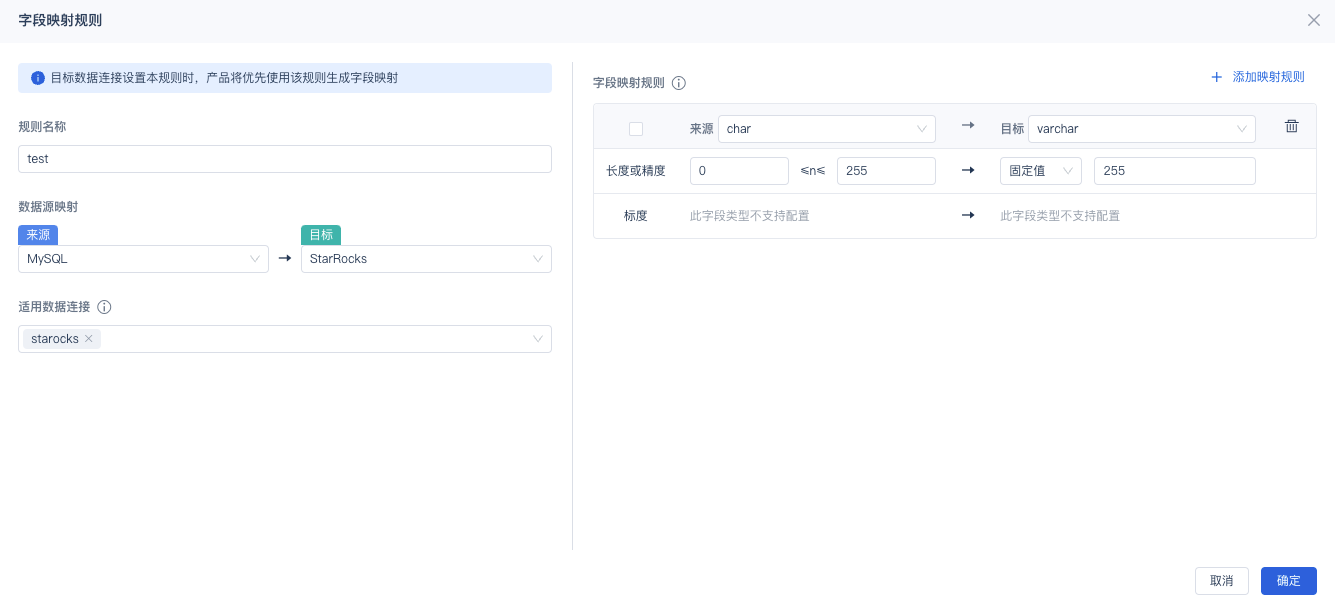 1)当前字段映射规则支持的数据源类型为:MySQL、Oracle、SQLServer、PostgreSQL、Greenplum、StarRocks、Doris