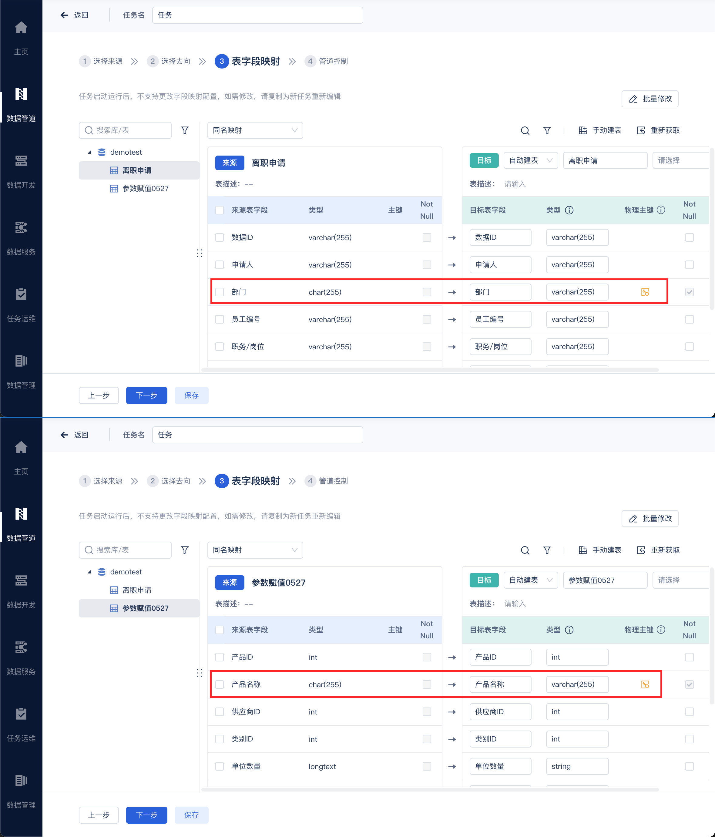在数据开发中即可看到同步的数据「表字段映射」中 char 类型字段改为 varchar 类型字段,同时字段长度和精度也按照字段映射规则修改,如下图所示: