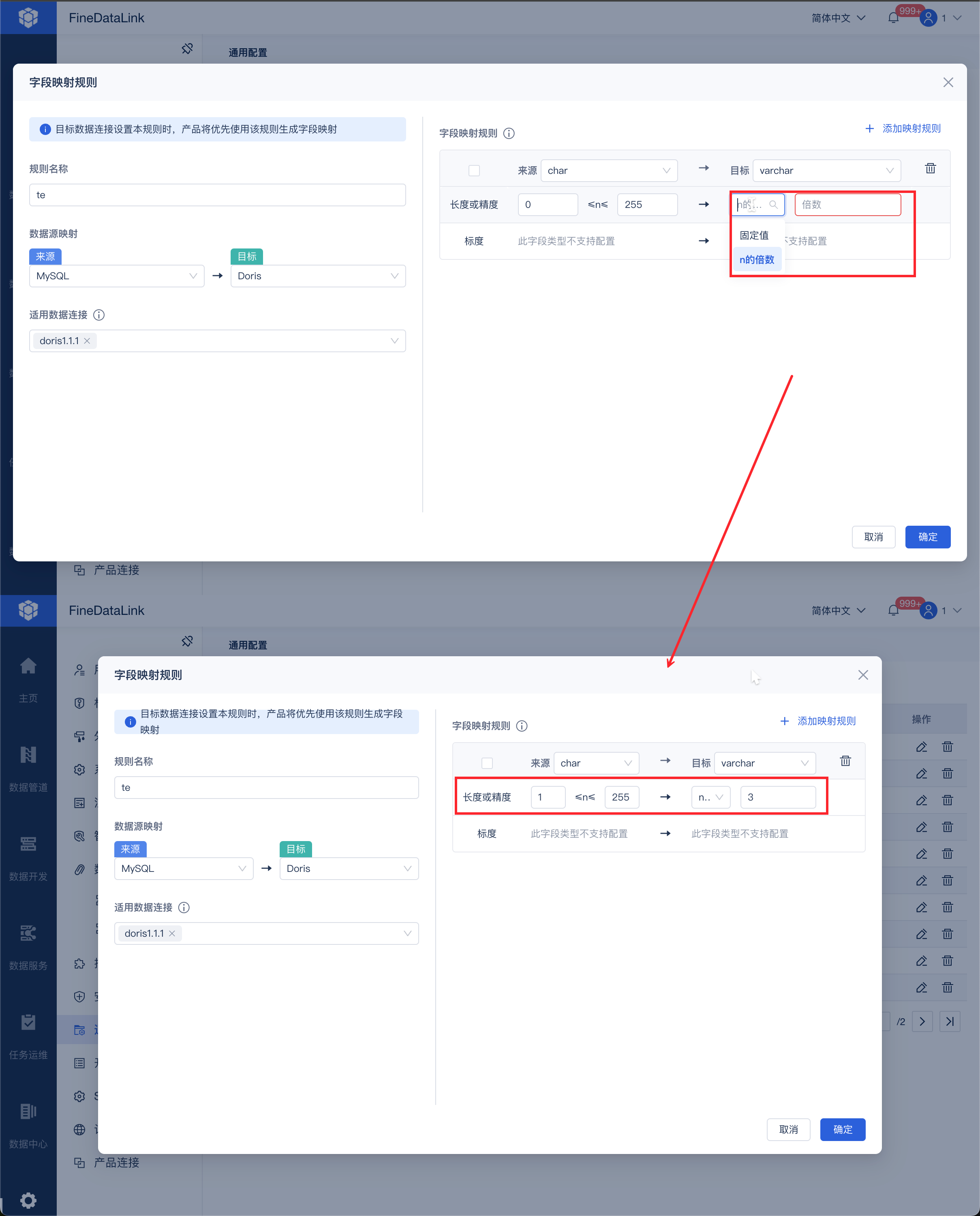 其中会有一个校验,用户设置的最终长度需要在字段类型的合法范围内,比如这里提示 n*倍数需要在 1-65533 范围里,因此需要调整前面的 n 的值 从 0-255 改成 1-255,如下图所示:
