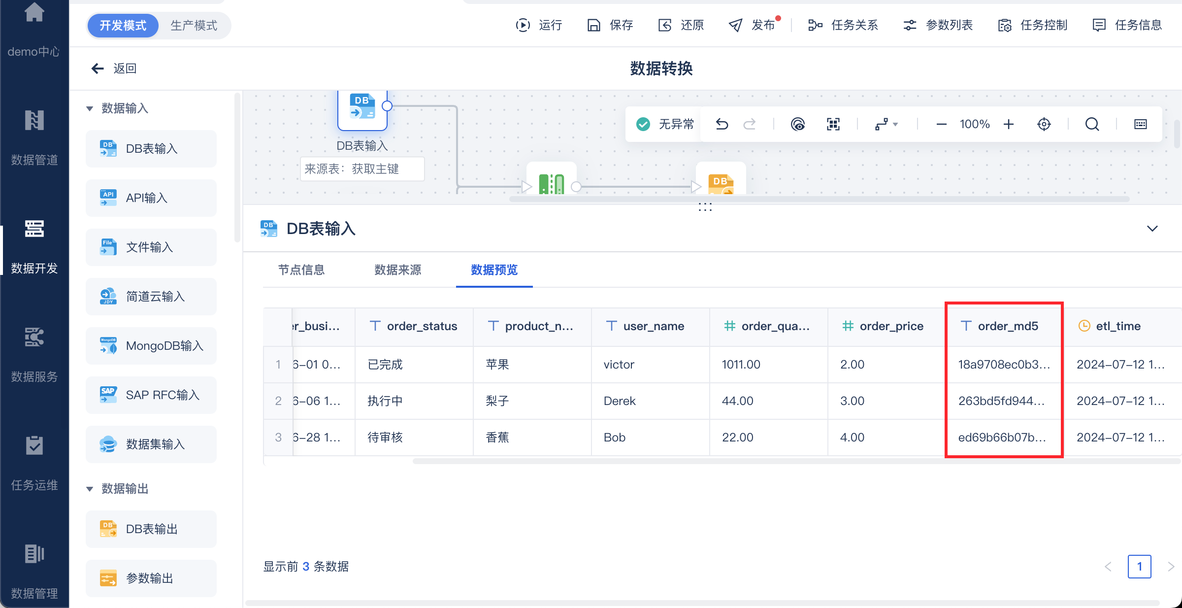 1)新建定时任务后,选择「数据转换」节点,进入编辑界面,新增一个 DB输入算子,取出来源表数据,同时新增一个 MD5 字段,方便后续作为比对字段,如下图所示: