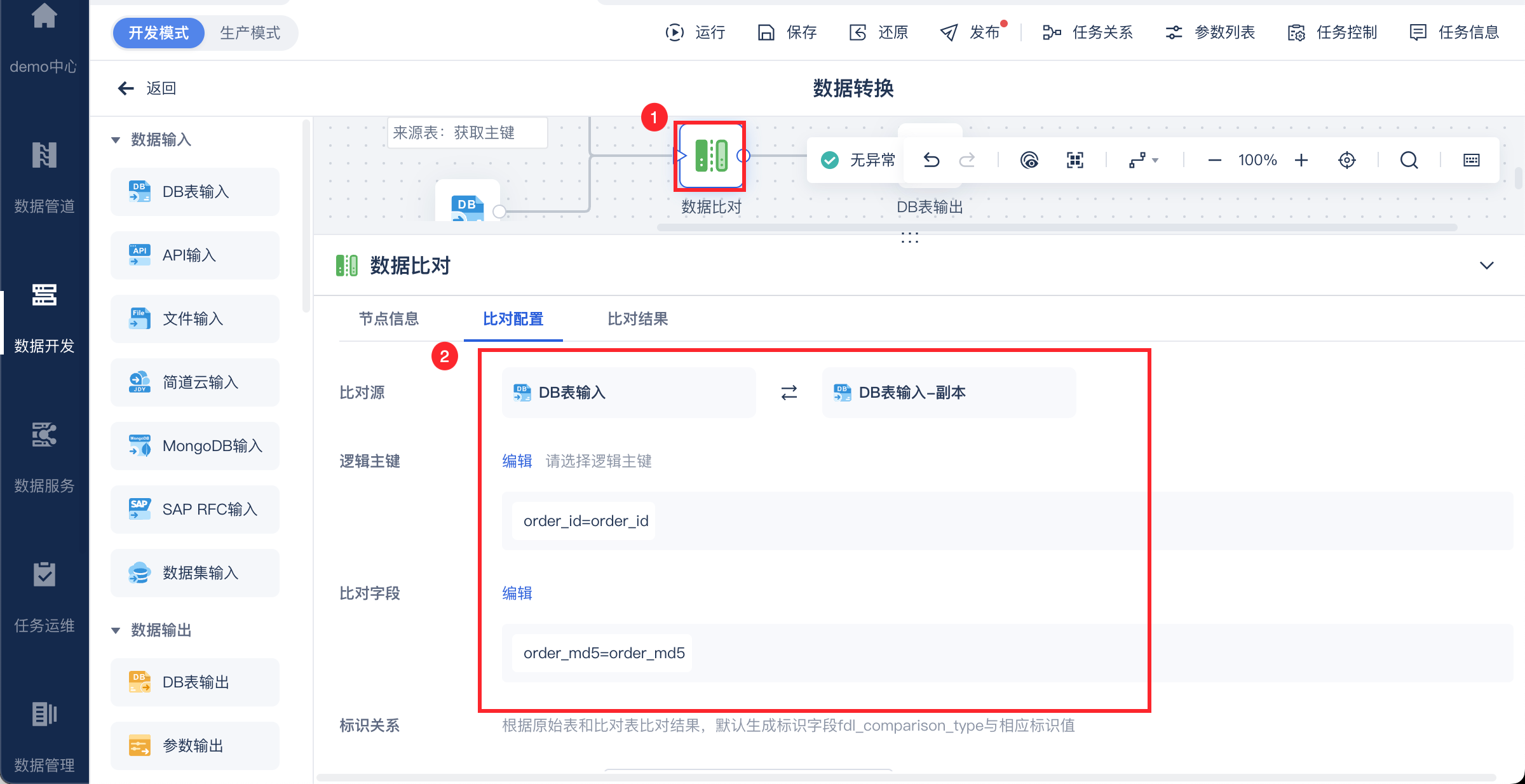 3)使用数据比对算子,比对来源表和目标表,设置逻辑主键为 order_id,比对字段为 order_md5,如下图所示: