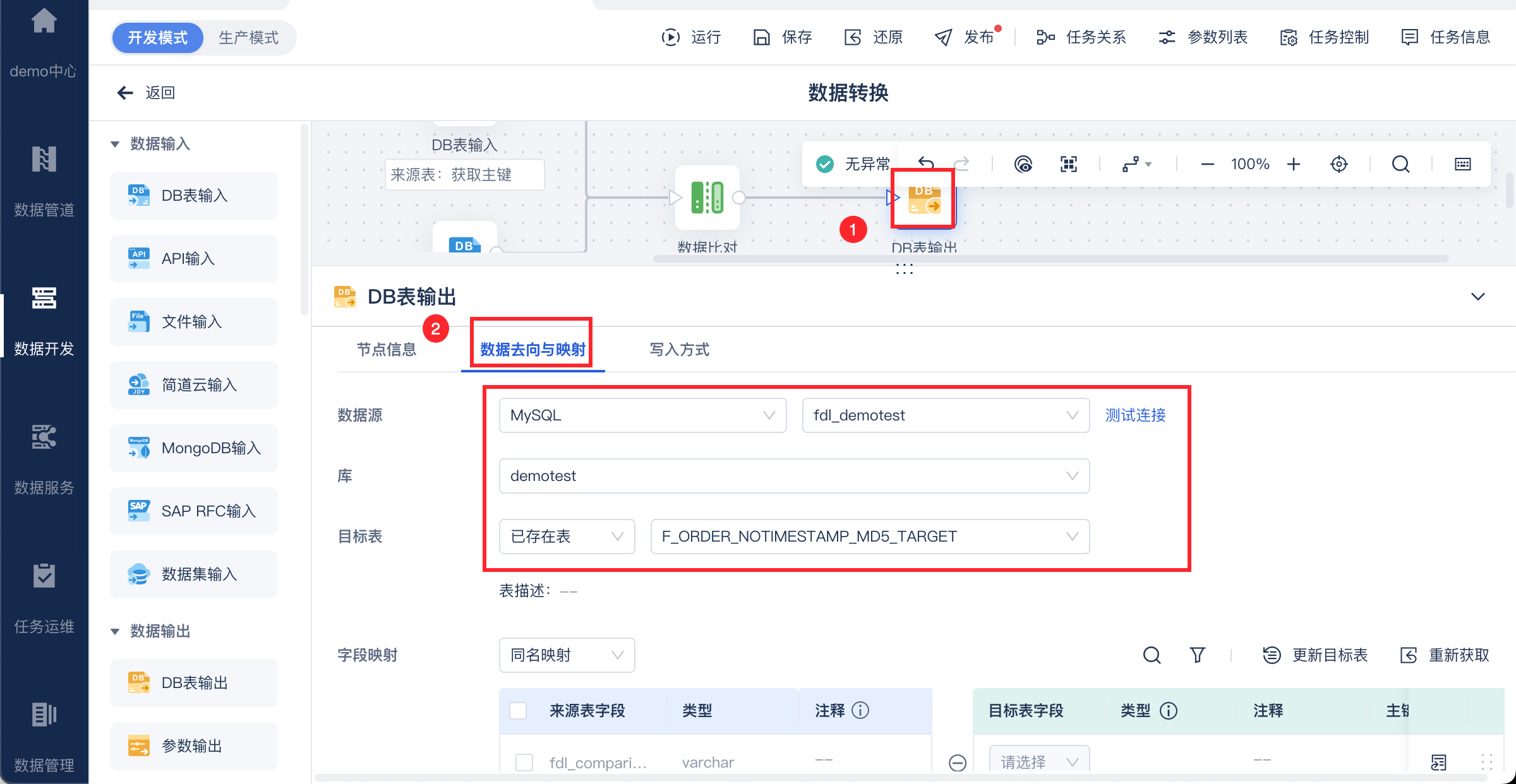 4)使用DB输出算子,将比对结果写入目标表,如下图所示: