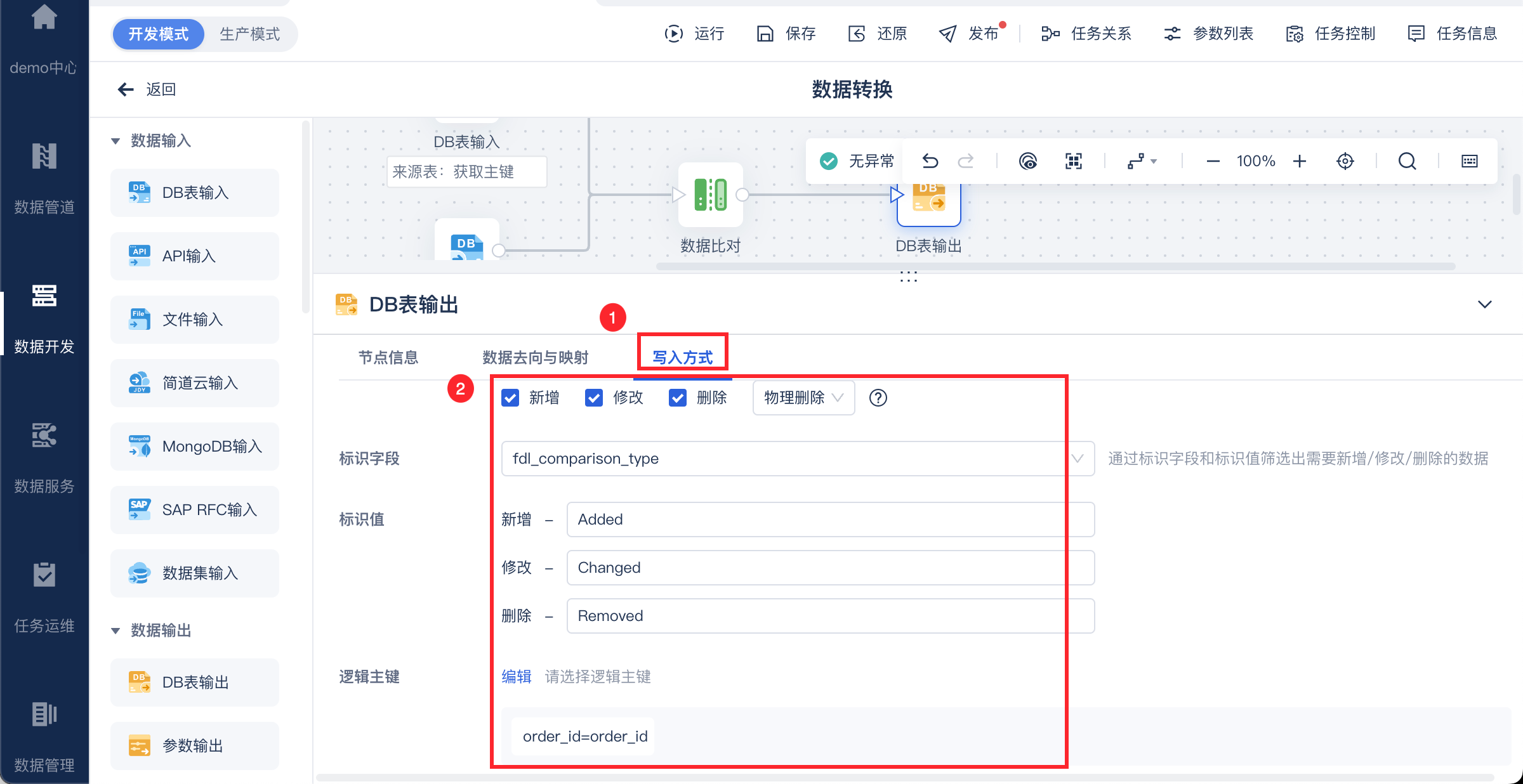 来源表制造比对字段「md5」,目标表也新增「md5」字段,并使用数据比对进行增删改变化标识,最终写入数据表中。