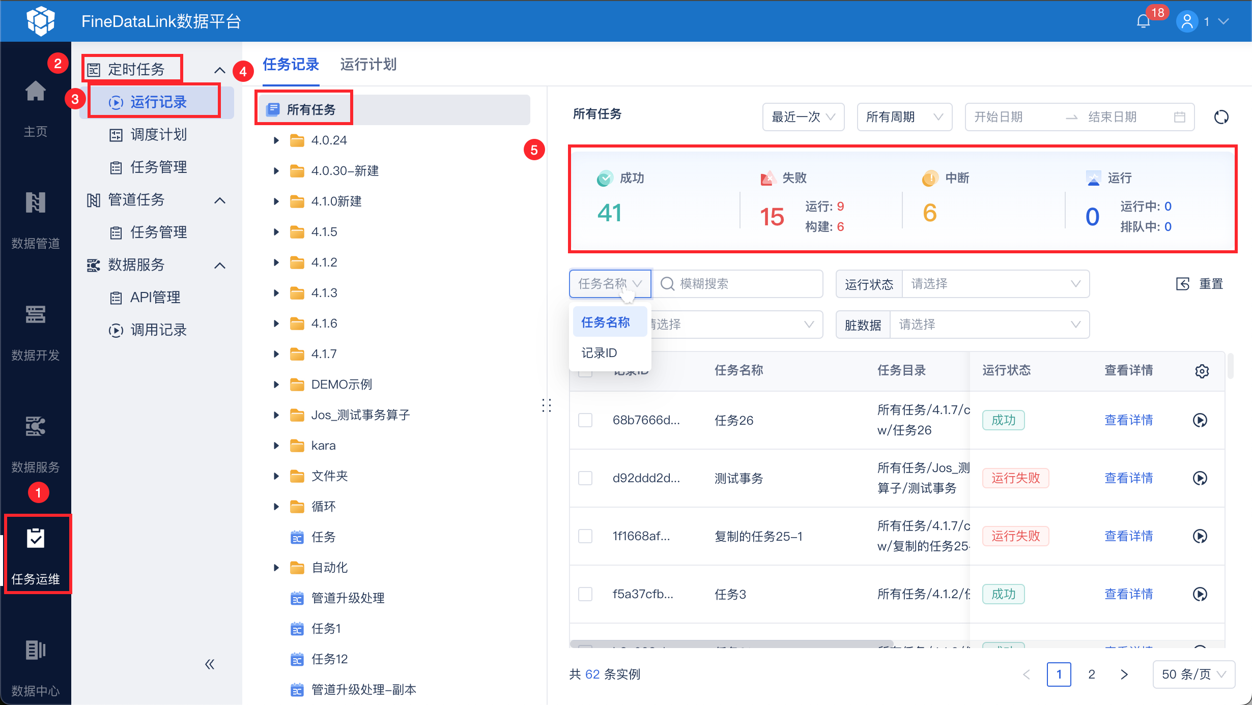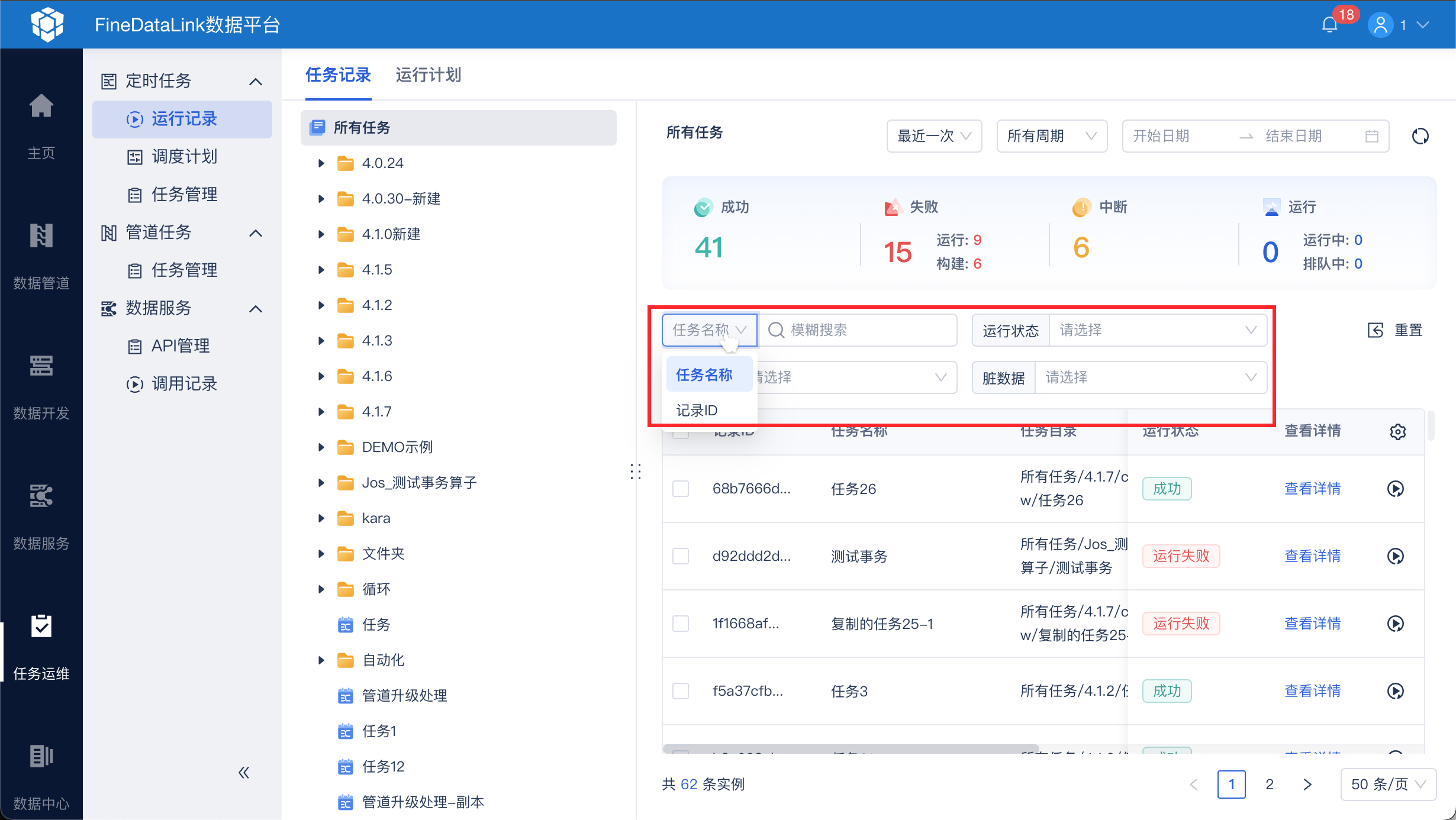 • 「运行记录>任务记录」中,可根据最近一次/全量记录、不同周期筛选任务运行记录