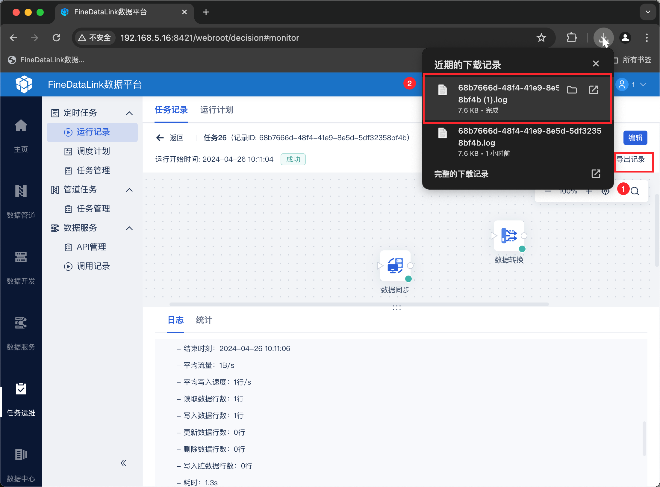 • 「运行记录>任务记录」中,表格新增「脏数据」列,展示脏数据行