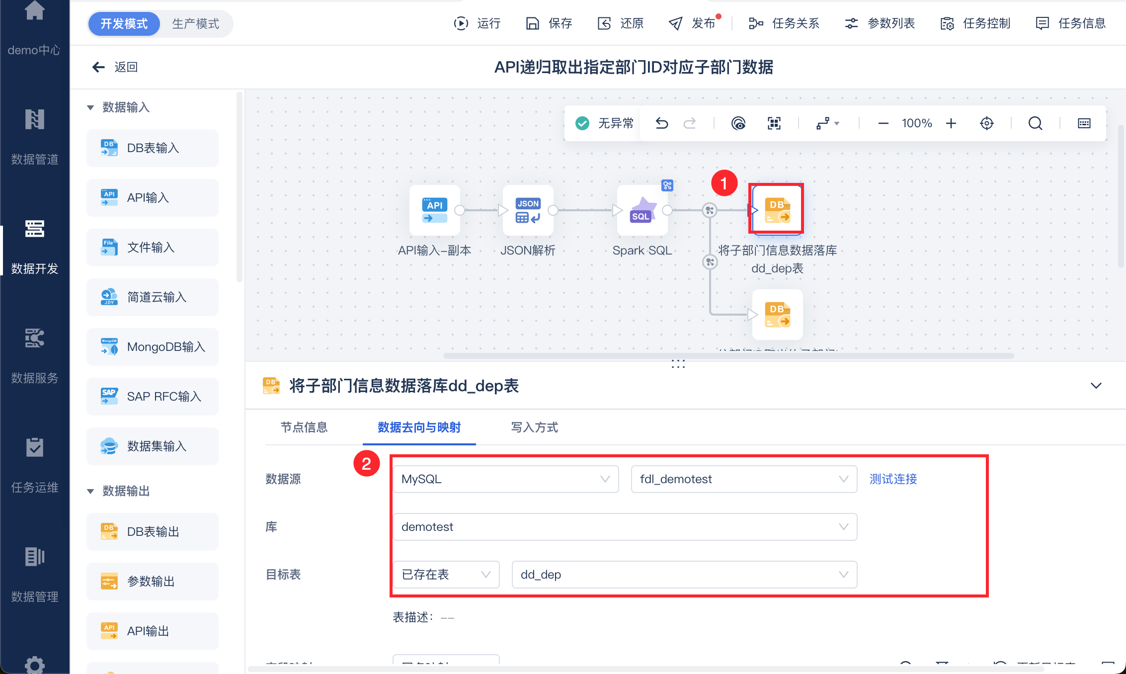 进入数据转换编辑界面,从 2.1.1 节落库的 dd_depid 数据表中读取部门ID,如下图所示: