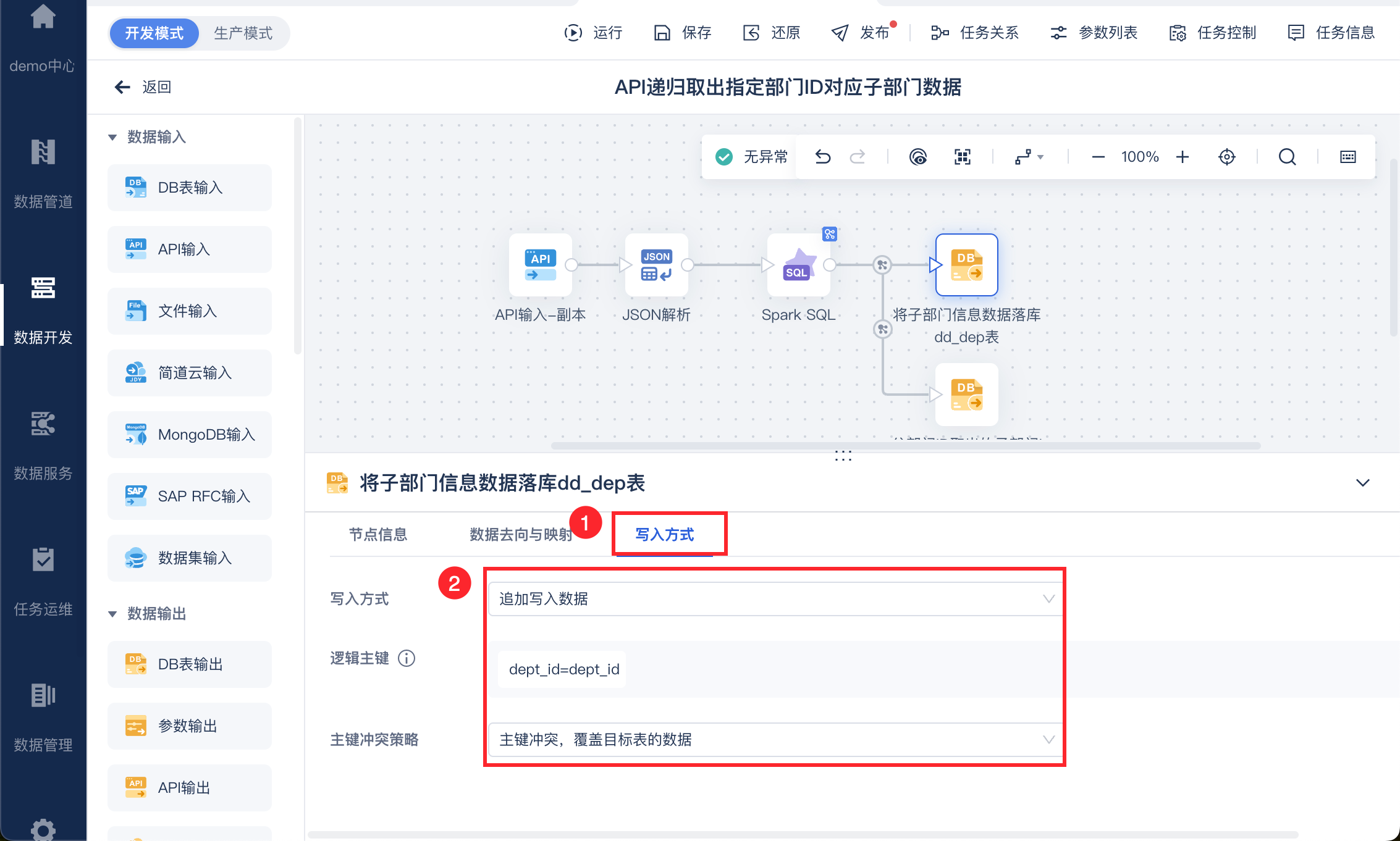 为了保证落库的最终数据表dept_id 字段数据唯一,因此设置为逻辑主键,并设置冲突策略,如下图所示: